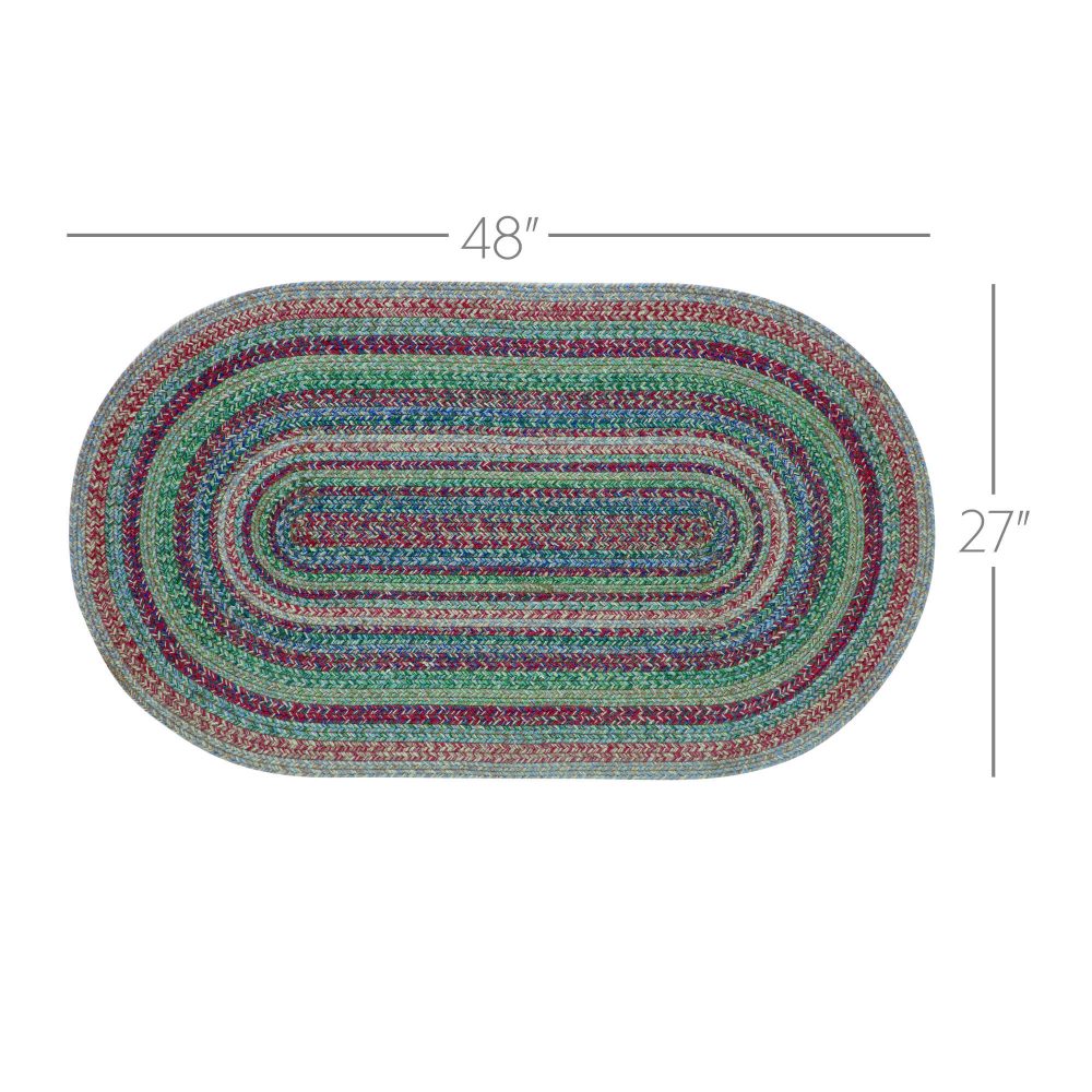 Create a bright, colorful look for your entryway with bold shades of blue, green, and red in a curl-resistant jute blend that adds style and safety. The Multi Jute Rug measures 27x48 inches and features a classic oval shape and tight braids constructed with a durable jute blend. The special blend relaxes faster and stays flat. The included PVC mat makes sure your beautifully braided jute rug stays exactly where it should. Features a blend of bold blue tones, forest greens, garnet red and natural tan for a joyful, country boho look that complements a wide array of modern and rustic farmhouse decor.