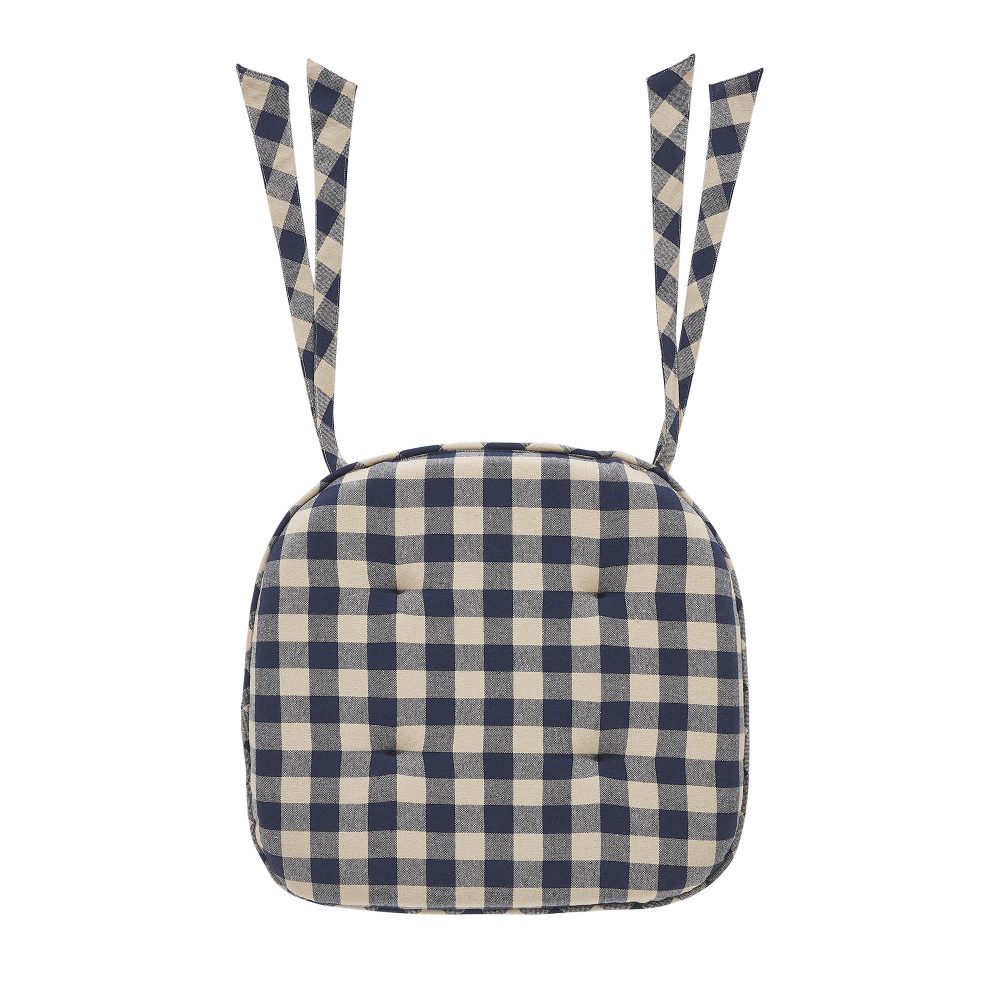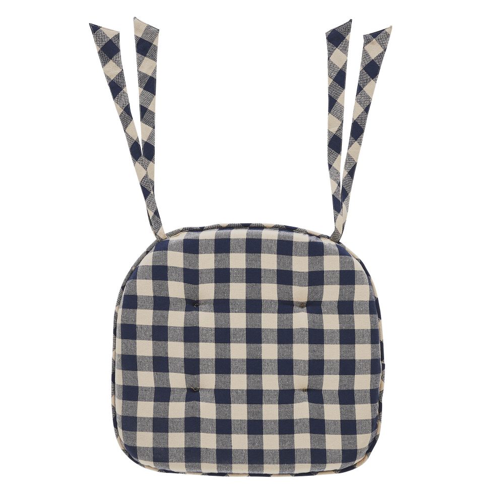 Experience the charm of Americana and country style with the VHC Brands Chair Pad from the My Country Collection. This chair pad, measuring 15.5x17 inches, is the perfect addition to your dining or kitchen chairs. Its tucked design adds a textured and inviting touch, making it ideal for indoor rocking chairs or farmhouse-style seating. The chair pad is equipped with ties to keep it securely in place while you dine or relax. Its navy and tan color palette in a classic check pattern adds a timeless and rustic appeal to your dining room or kitchen. Crafted with a firm and comfortable filling, this chair cushion provides a cozy and supportive seat for you and your guests. Not only does this chair pad enhance your seating decor, but it also offers durability and practicality. The My Country Collection Chair Pad is designed to withstand everyday use, making it a stylish and functional addition to your home. Elevate your dining or kitchen chairs with this versatile accessory, seamlessly blending Americana and country elements while providing a firm and comfortable seat.