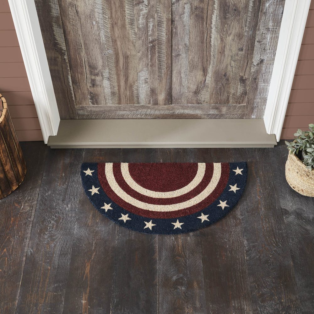Welcome guests to your home with the My Country Collection's Coir Welcome Door Mat, a proud and patriotic addition to your front porch or entryway. This half-circle 16.5x33-inch doormat showcases the spirit of Americana with its striking Patriotic Stars and Stripes design, making it the ideal choice for enhancing your outdoor fall decor. Crafted with a bristled and textured coir surface, it creates an inviting atmosphere that welcomes friends and family with open arms. Designed for both indoor and outdoor use, this coir doormat features PVC backing for enhanced durability and slip resistance, ensuring it stands up to the elements year-round. Its slim profile easily fits beneath most doors, and the eco-friendly coir material aligns with modern sustainability values. Elevate your entrance with the My Country Collection's Coir Welcome Door Mat, offering a warm and patriotic touch that celebrates the heart of America. Upgrade your doorway with the My Country Collection's Coir Welcome Door Mat, where the Patriotic Stars and Stripes design adds a touch of Americana pride to your porch or exterior entryway. Crafted from premium coir, this doormat provides a textured surface that feels inviting, and its eco-conscious construction aligns with modern sustainability values. This doormat's durable design ensures it thrives outdoors in any season, welcoming gatherings of all sizes. Celebrate your love for your country and home with this striking, Americana-inspired doormat that shines as brightly as the American sun.