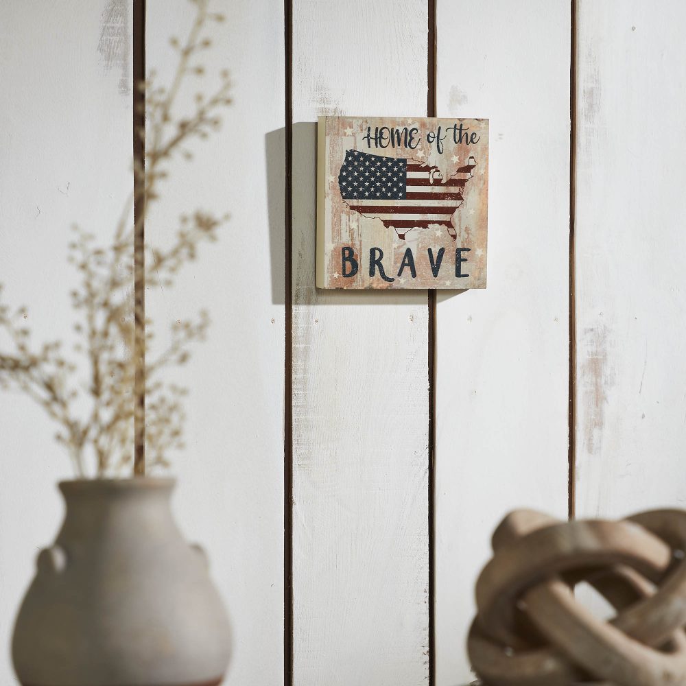 Celebrate the spirit of patriotism with the VHC Brands Patriotic My Country Home Of The Brave American Flag On Map MDF Block Sign 6x6x1. This decorative sign features a striking map of the United States designed in a vibrant flag theme, proudly displaying the phrase "Home of the Brave" in bold blue lettering. Encircled by small stars and finished with a deeply distressed appearance, this piece exudes rustic charm and pays homage to American pride. Perfect for any room, this square block sign enhances the decor of living rooms, dining rooms, kitchens, bedrooms, bathrooms, or entryways. Its classic color palette of light tan, dark blue, and red complements rustic farmhouse and country-style interiors, making it a versatile addition to your Independence Day celebrations or everyday patriotic displays. The compact size makes it ideal for shelves, mantels, countertops, or tabletops, adding a touch of Americana to your home. Maintaining the VHC Brands Patriotic My Country Home Of The Brave Block Sign is effortless-simply wipe it clean with a soft cloth to preserve its vibrant digital print and distressed finish. Whether displayed on its own or as part of a larger patriotic arrangement, this block sign combines quality craftsmanship, timeless design, and heartfelt sentiment. It's the perfect way to celebrate freedom and honor the brave individuals who define the American spirit.