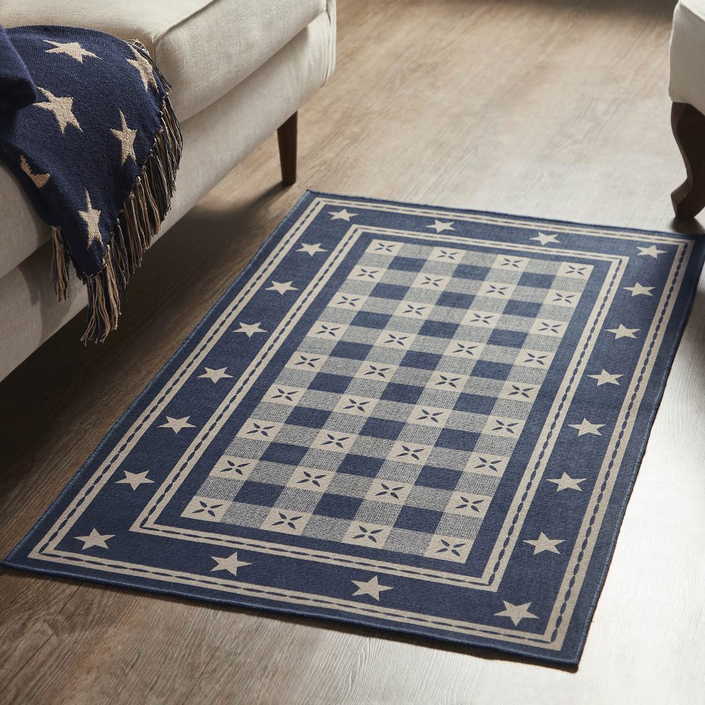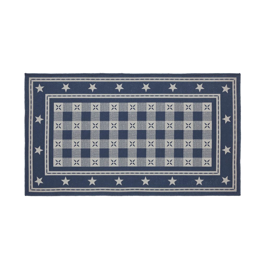 Introduce Americana charm to your indoor living spaces with the My Country Rug by VHC Brands. Measuring a generous 27x48 inches, this rectangular polyester area rug from the My Country Collection brings a stars print design inspired by the heart of the Country. The rich Deep Indigo color creates a bold and captivating centerpiece for your floor decor. The My Country Rug seamlessly combines elements of Americana and Country style, making it an ideal choice for enhancing your home's decor. This 27x48-inch polyester area rug features a captivating stars print, inspired by the rural heartland of America, adding a touch of nostalgia to your living spaces. Deep Indigo, a bold and inviting shade, makes this rug an attention-grabbing piece that beautifully complements your indoor ambiance. No-slip latex backing helps the rug stay where you want it. Elevate your decor with the My Country Rug, a striking 27x48-inch polyester area rug from the My Country Collection. Its captivating stars print design is a tribute to the heart of the Country, seamlessly blending elements of Americana and Country style. The Deep Indigo hue infuses a sense of nostalgia and warmth, making this rug an inviting centerpiece that enhances high traffic spaces, perfect for adding personality to your floor decor.