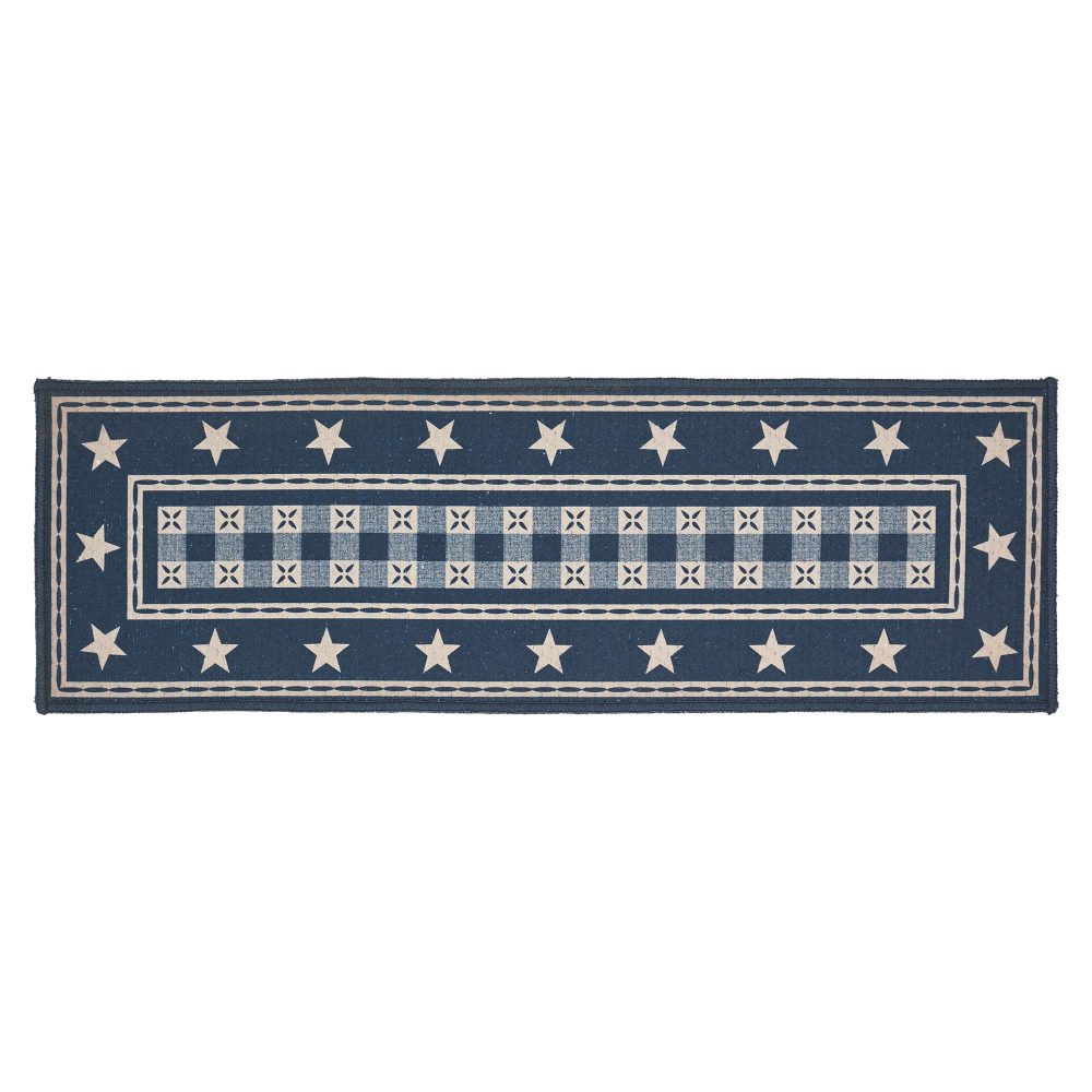 Introducing the VHC Brands My Country Stair Tread, a perfect addition to your country-style and farmhouse decor. Crafted with care and attention to detail, this rectangular 8.5x27-inch stair tread exudes the charm of Americana living. Its deep indigo hue, inspired by the My Country Collection, creates a warm and inviting atmosphere in your entryway or living room. This versatile stair tread offers both style and functionality, with a durable polyester construction that can withstand high traffic use. The graphic print design adds a touch of rustic country appeal to your space, making it an ideal choice for those who appreciate Americana-inspired accents. Elevate your home's aesthetic with the VHC Brands My Country Stair Tread, a welcoming addition to your living space that embodies the spirit of country living. Whether you're looking to enhance the beauty of your home's entryway or provide a cozy accent to your living room, this stair tread is designed to meet your needs. Its deep indigo color and country-inspired design blend seamlessly with your decor, setting the stage for an inviting atmosphere that reflects the charm of Americana living.