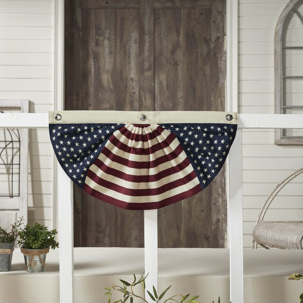 Celebrate your patriotic spirit with the VHC Brands Patriotic My Country Stars & Stripes Bunting Flag 12x24. This classic half-circle bunting flag showcases bold red and creme stripes down the center, flanked by navy blue panels adorned with creme stars. The timeless stars-and-stripes design captures the essence of Americana charm, while the durable grommet holes make it easy to hang this banner on railings, walls, or entryways. Perfect for Fourth of July festivities or year-round patriotic decor, this decorative banner adds a festive touch to any room. Whether displayed in your living room, dining room, or entryway, its bold colors and traditional design create a warm and welcoming atmosphere. Its compact size makes it versatile enough to adorn smaller spaces, yet impactful enough to stand out as a centerpiece of your Independence Day celebration. Crafted from durable polyester, the VHC Brands Patriotic My Country Stars & Stripes Bunting Flag is built for lasting beauty. Its high-quality digital print ensures vibrant, fade-resistant colors, while the easy-care fabric can be hand-washed to maintain its fresh appearance. This bunting flag combines practicality and style, offering a meaningful way to honor America's heritage and showcase your pride in its history.