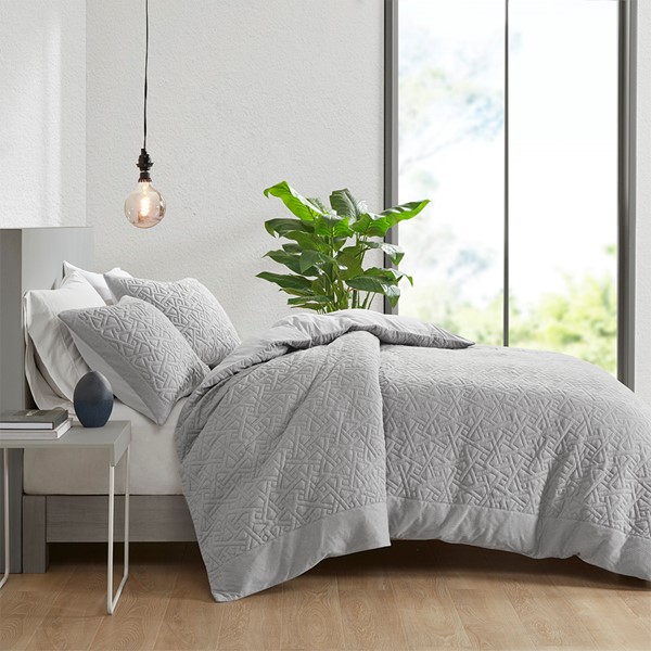 The simple elegance of the N Natori Origami 3 Piece Knit Quilted Top Oversized Duvet Cover Mini Set offers an elevated update to your bedroom. Made from rib sweater knit fabric, this modern duvet cover flaunts an embroidered pattern for an upscale quilted top look. The 2 matching shams repeat the modern geometric design of the duvet cover and feature zipper closures to provide a clean finished edge. Oversized for better coverage on high depth mattresses, this quilted duvet cover set adds a super soft and sophisticated charm to elevate your bedroom decor. A button closure at the foot end secures a padded insert within the duvet cover and 4 inside corner ties prevent it from shifting (insert is NOT included). Machine washable for easy care. Coordinating decorative pillow is available and sold separately.