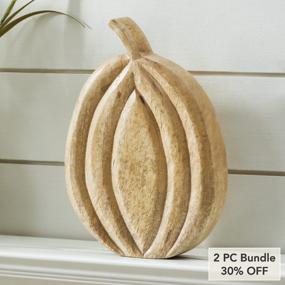 - Sku – 89822 – Natural Carved Wooden Pumpkin Fall Farmhouse Tabletop Decor Rustic Solid Wood Autumn Accent 10×7.25×1.5 inches (2 Packages)