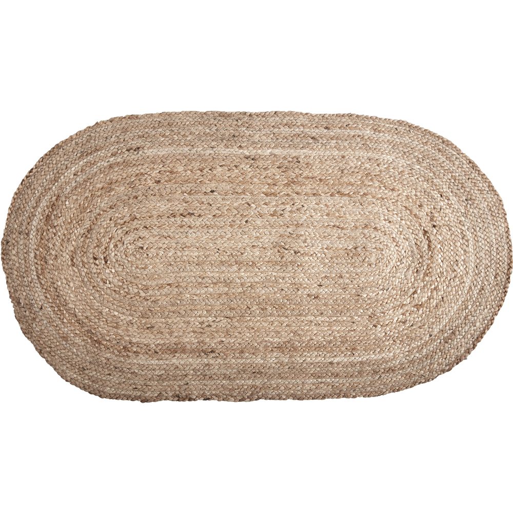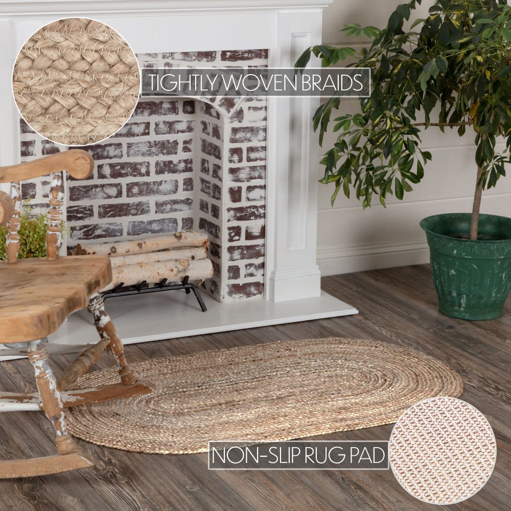 Create a warm, homey feeling with the natural texture and color of pure jute woven to add style and safety anywhere a mid-size accent rug is needed. The Natural Jute Rug measures 27x48 inches and features a classic oval shape and tight braids constructed with a durable jute fiber. The included PVC mat makes sure your beautifully braided jute rug stays exactly where it should. The timeless loops of braided tan create a classic look that complements a wide array of country farmhouse decor.
