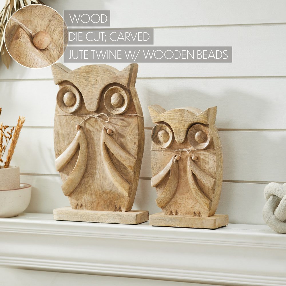 - PREMIUM MATERIALS & PRECISE DIMENSIONS: Elevate your home decor with this set of two exquisitely hand-carved solid tropical wood horned owl figurines, each showcasing a smooth, natural light finish and a charming twine bow accent; the larger piece measures 13.25 inches high x 8 inches wide x 2 inches deep, complemented by its smaller companion at 9.75 inches high x 6 inches wide x 2 inches deep, offering durable and easy-to-maintain rustic, farmhouse, or primitive style.