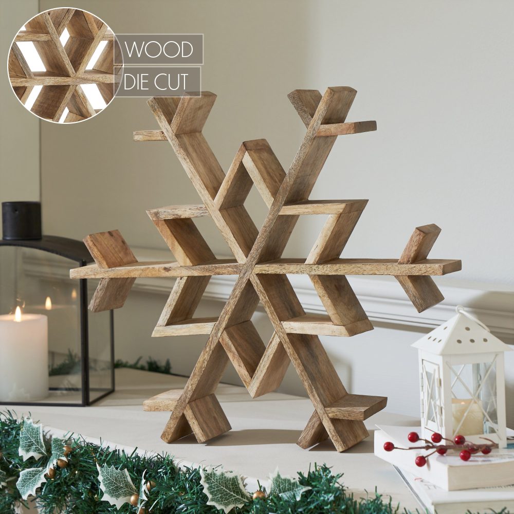 - Wooden Snowflake Design: Features a charming wooden snowflake outline in a light natural tan shade, perfect for adding a rustic and primitive touch to your Christmas and winter decor.
