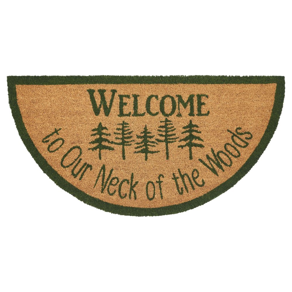 Welcome guests with rustic charm using the VHC Brands Neck Of Woods Coir Welcome Rug Half Circle 16.5x33. This beautifully crafted doormat features a natural tan coir base, adorned with the inviting message "Welcome to Our Neck of the Woods" encircling stenciled trees in black forest green. The half-circle design adds a unique touch to your entryway, combining style and practicality for those who appreciate a deep woods aesthetic in their home decor. Designed for durability and functionality, this coir rug is perfect for high-traffic areas like entryways or kitchens. Its natural coir fibers effectively trap dirt, while the non-slip PVC backing keeps the rug securely in place, preventing slipping. The forest green trees and rustic message evoke a cozy, woodland feel, making it an ideal addition to a rustic or primitive-themed home. For easy maintenance, simply shake or vacuum to remove surface dirt. To preserve the rug's vibrant colors and extend its life, it's recommended to keep the VHC Brands Neck Of Woods Coir Welcome Rug in a sheltered entryway. Whether you're looking to add a decorative accent to your front porch or create a warm, welcoming atmosphere inside, this rug blends rustic charm with everyday functionality, making it a perfect choice for any country-inspired space.