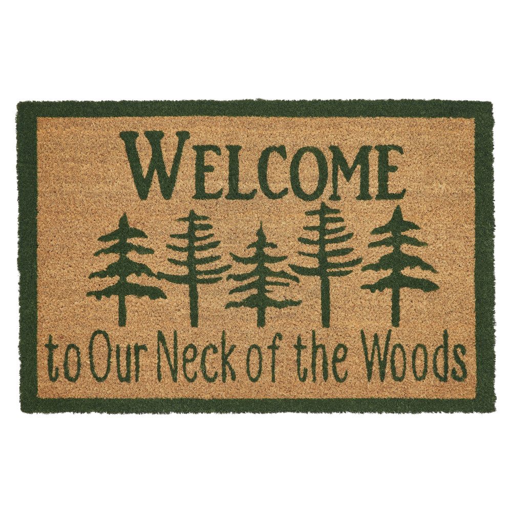 Welcome guests with the inviting charm of the VHC Brands Neck Of Woods Coir Welcome Rug Rect 20x30. This delightful doormat features the warm greeting "Welcome to Our Neck of the Woods," beautifully showcased on a natural tan base. Encircled around silhouettes of trees in rich black forest green, this rug adds a touch of rustic elegance that enhances any entryway. Crafted from durable coir, this rug is designed to trap dirt and debris effectively, helping to keep your home clean while providing a decorative touch. The rectangular shape fits perfectly at your doorstep, and the non-slip PVC backing ensures stability, preventing slips and keeping the mat securely in place, even in high-traffic areas. The combination of welcoming text and natural imagery creates a cozy atmosphere that resonates with nature lovers. For easy maintenance, simply shake or vacuum the rug to remove surface dirt. To prolong its vibrant colors and extend its lifespan, it's best to keep the VHC Brands Neck Of Woods Coir Welcome Rug in a sheltered entryway. Combining practicality with rustic charm, this rug is an essential addition to any home looking to greet visitors with warmth and style.