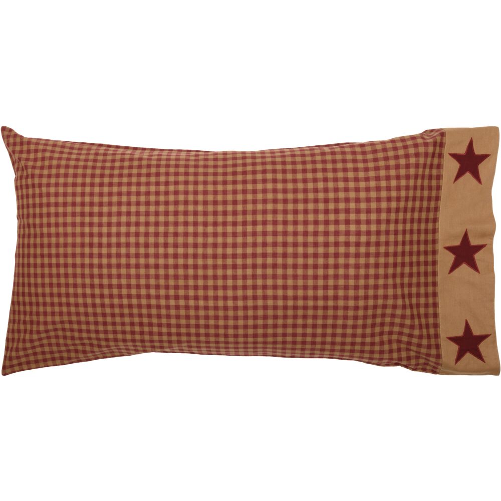 Relax in comfort with soft, 100 percent cotton fabric in a rich burgundy red and khaki tan checked plaid. The Ninepatch Star King Pillow Case Set includes two 21x40 inch covers in rustic shades to bring classic country comfort to a simple gingham print. A contrasting cuff in khaki tan is adorned with applique stars in burgundy for a charming western look. Coordinate with bedding and more from the Ninepatch Collection by VHC for more casual designs that elevate your primitive country decor.