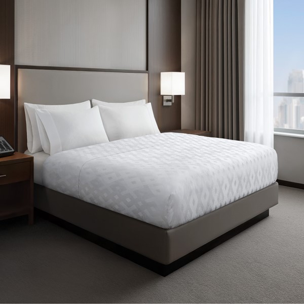 Our Nomad Home(r) Essential Coverlet series provides a touch of elegance at an affordable price. The Jacquard fabric Nova pattern is subtle yet striking and designed to fit with any hotel room decor. The Essential Coverlet is treated with Fuze(r) permanent and all natural antimicrobial for a fresher product with long lasting durability and features like microplastic shed reduction and UVA/UVB protection to retain the pattern and coloring. Generously sized to cover the bed and machine washable for ease in care and longevity.