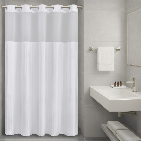 Shower Curtain: White, 100% Polyester, jacquard stripe,single needle, 15″ Voile sheer window, all-in-one rings.