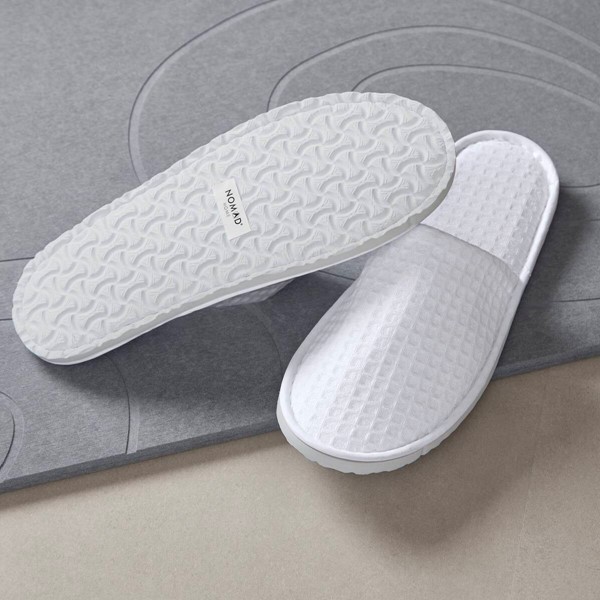Step up guest comfort with the Nomad Home(r) Premium Slippers, designed to deliver an elevated, spa-inspired feel with lasting quality. These closed-toe slippers feature a breathable cotton-poly waffle upper, paired great padding for soft support, the reinforced lock stitching enhances durability during repeated use. Ideal for premium rooms, wellness amenities, or in-room spa services, these slippers are easy to care for and crafted for guest satisfaction.