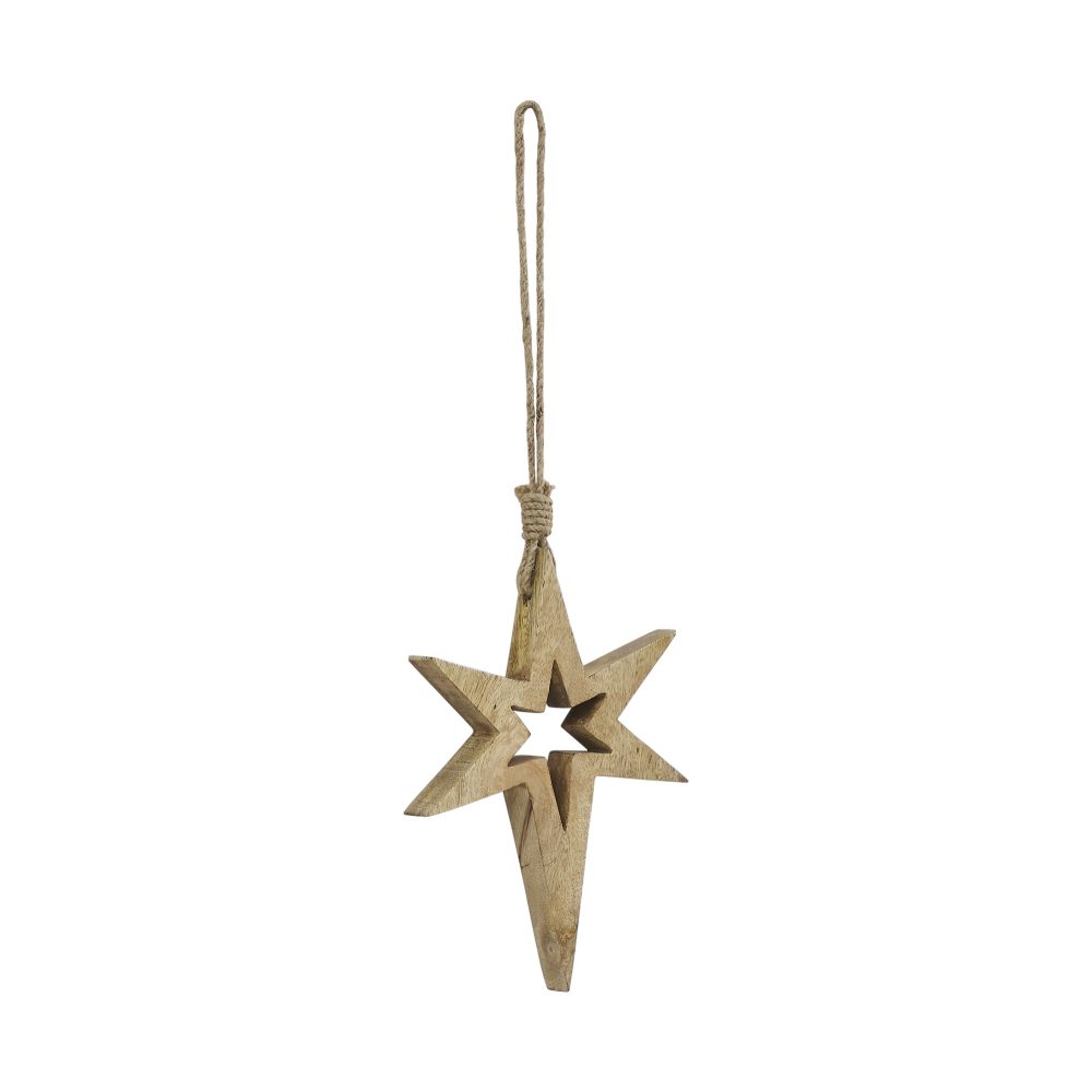 Add a natural, rustic accent to your holiday decor with the VHC Brands Northern Yule Wooden Star. Crafted from tropical wood, this decorative wall hanging features a traditional Northern star shape in a warm natural wood tan finish. The open center and lightly distressed surface give it a handcrafted, primitive feel that's perfect for cozy winter and Christmas themes. Measuring 6 inches wide by 8 inches tall, this compact star ornament is ideal for hanging on walls, doors, or incorporating into layered mantel or shelf displays. Its neutral tone and solid color design allow it to blend effortlessly with a variety of holiday styles, from farmhouse to minimalist. The open center adds visual interest without adding bulk, making it a versatile addition to your seasonal decorating. Perfect for the bathroom, bedroom, dining room, entryway, kitchen, or living room, this wooden star brings a timeless, festive touch to any space. Its simple, country-inspired look provides warmth and character throughout the holiday season. For easy upkeep, just wipe clean with a soft cloth to maintain its rustic charm year after year.