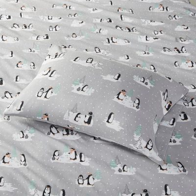 True North by Sleep Philosophy Cozy Cotton Flannel Printed Sheet Set in Grey Penguins, Full TN20-0367