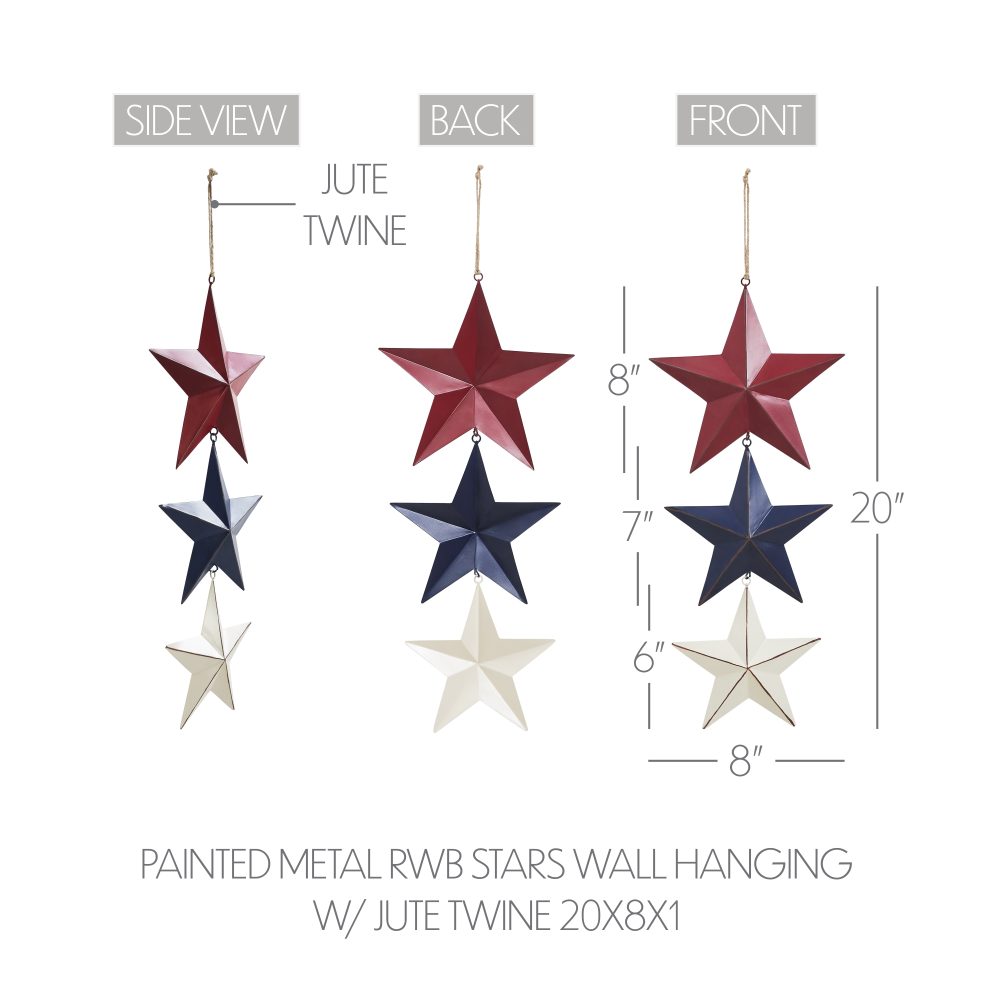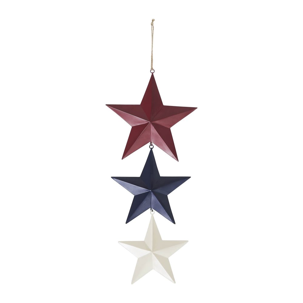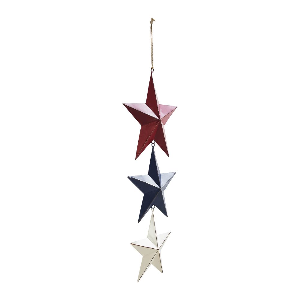 Celebrate Americana charm with the VHC Brands Patriotic Painted Metal RWB Stars Wall Hanging w/ Jute Twine 20x8x1, a decorative accent perfect for Independence Day and rustic farmhouse decor. This unique piece features three faceted barn stars in distressed finishes of burgundy, navy, and creme, connected with jute twine to form an elegant hanging star chain. Each star progressively decreases in size, creating a cascading effect that adds depth and visual interest to your space. Designed to enhance any indoor area, this wall hanging is ideal for living rooms, dining rooms, kitchens, bedrooms, bathrooms, or entryways. Its patriotic color scheme and weathered, vintage-inspired look make it a versatile decor piece that complements country, rustic, and Americana-themed interiors. The jute twine adds a natural, handcrafted touch, making this wall hanging a charming and timeless addition to your seasonal or year-round decor. Maintaining the VHC Brands Patriotic Painted Metal RWB Stars Wall Hanging is simple-just wipe it clean with a soft cloth to preserve its distressed finish and vibrant colors. Whether displayed on its own or paired with other patriotic accents, this decorative piece is a stylish and durable way to showcase your love for Americana and rustic elegance. Perfect for Independence Day celebrations or as a year-round farmhouse accent, this wall hanging delivers quality craftsmanship and timeless charm.