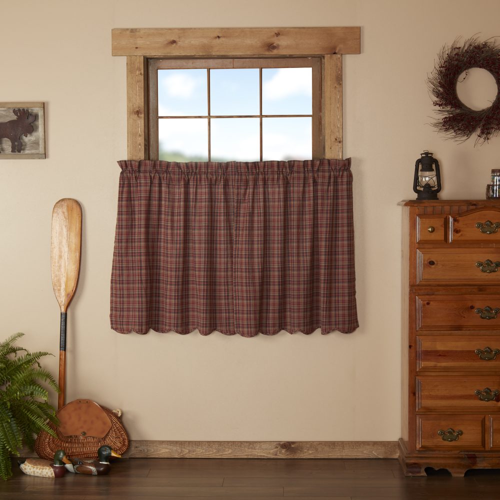 Visually stunning, the Parker Scalloped Tier Set features warm burgundy, tan, and dark navy plaid with a scalloped edge. Expertly crafted from cotton, these L36xW36 curtains transform your living room, dining room, or kitchen windows with unique, rustic charm. A white lining diffuses the sun's light in your home. Finished with a rod pocket and hanging loops for convenience.