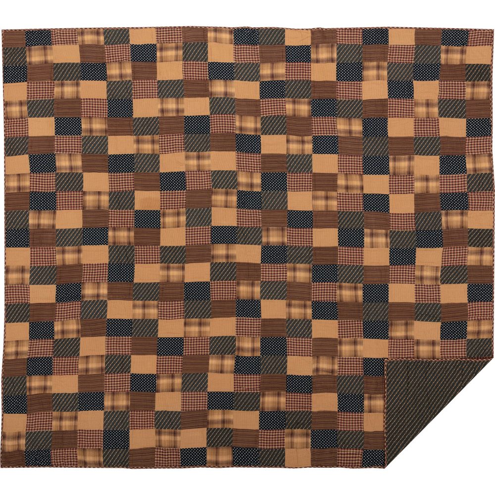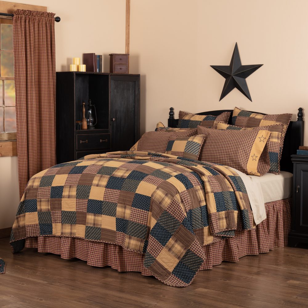 Add rustic Americana style to your bed with a sturdy, heirloom-quality quilt in a patriotic patchwork of deep red, soft tan and navy blue. The Patriotic Patch King Quilt includes one 110x97-inch quilt. The primitive Americana bedding features real patchwork blocks handmade with care for lasting quality and timeless style. A variety of vintage patterns add cozy rustic charm to your bedroom. The quilt is machine washable and iron safe and crafted in 100 percent cotton for a soft feel and durable wear. The bedspread reverses to navy floral. Coordinates with the Patriotic Patch Collection by VHC for matching modern primitive window treatments, bathroom accessories and bedding to bring the best of eye-catching American country style to every corner of your home.