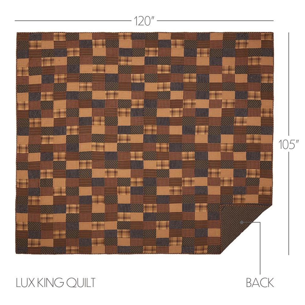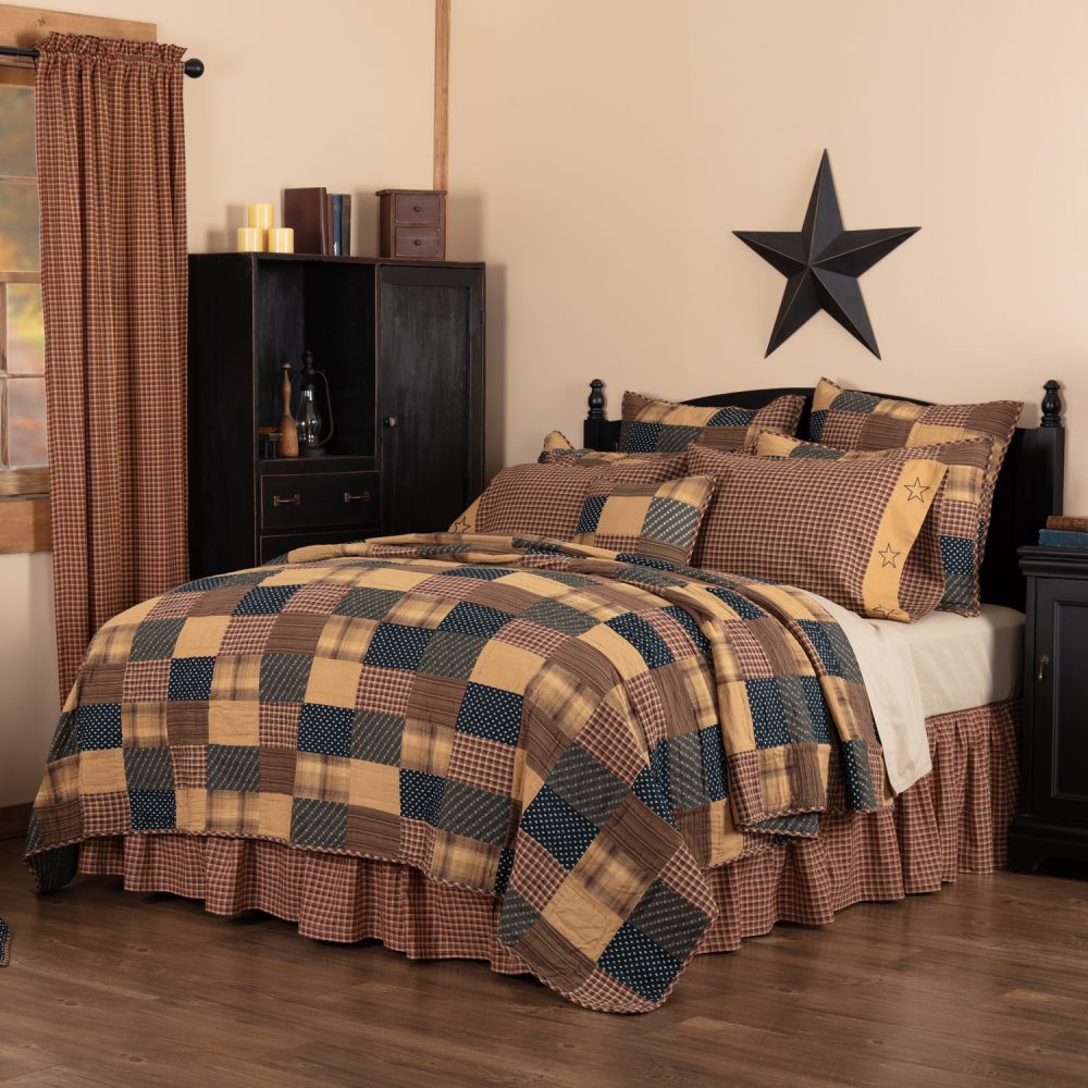 Add rustic Americana style to your bed with a sturdy, heirloom-quality quilt in a patriotic patchwork of deep red, soft tan and navy blue. The Patriotic Patch Luxury King Quilt includes one 120x105-inch quilt. The primitive Americana bedding features real patchwork blocks handmade with care for lasting quality and timeless style. A variety of vintage patterns add cozy rustic charm to your bedroom. The quilt is machine washable and iron safe and crafted in 100 percent cotton for a soft feel and durable wear. The bedspread reverses to navy floral. Coordinates with the Patriotic Patch Collection by VHC for matching modern primitive window treatments, bathroom accessories and bedding to bring the best of eye-catching American country style to every corner of your home.