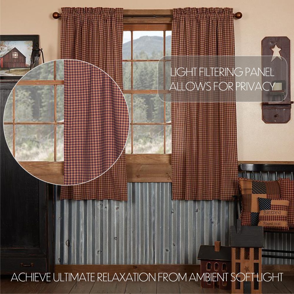 Decorate your windows with a touch of patriotic, primitive country style with this charmingly designed and thoughtfully crafted window panel set. Displaying a timeless country look with a classic, tartan plaid in natural tan, deep red and navy blue, the Patriotic Patch Short Panel Set 63x36 enhances your home decor with a primitive Americana feel. This 100% cotton curtain set includes two panels with a white lining to prevent fading and provide additional privacy. It includes a rod pocket for easy hanging.