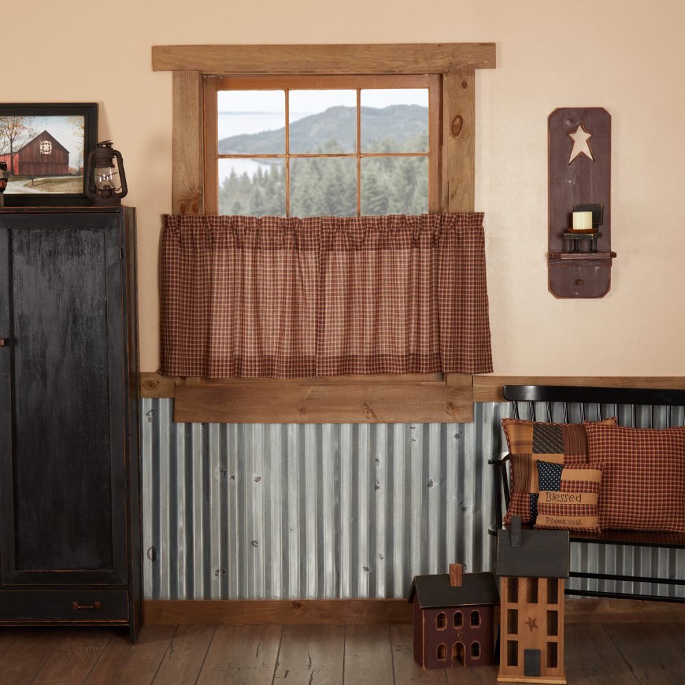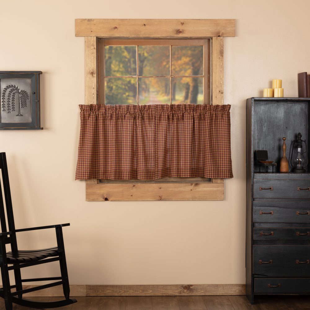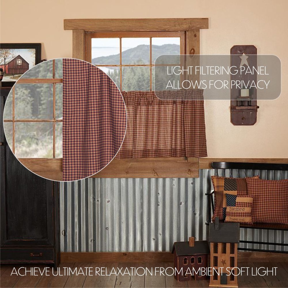 A traditional plaid pattern gets a primitive Americana update with muted tones of red, blue and beige for a patriotic and cozy design. The Patriotic Patch Plaid Tier Set measures 24x36 and features a timeless look with straight edging. Rod pockets are included near the top of this plaid valance for easy hanging.