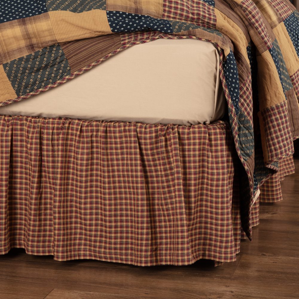 A vintage plaid pattern in deep red, khaki, and navy blue provides the perfect foundation for your primitive Americana bedding. The Patriotic Patch Queen Bed Skirt measures 60x80 inches and features a long 16-inch drop to ensure the skirt reaches your floor. The country style dust ruffle adds a lovely finishing touch to any room by complementing your decor while concealing under-bed storage and blocking dust accumulation in hard-to-reach areas. A generous 3-inch decking border provides increased durability for extended use. Made of 100 percent cotton, this traditional plaid bed skirt is machine washable and iron safe. Coordinates with the Patriotic Patch Collection by VHC for primitive country style and pairs with the Patriotic Patch Quilt (sold separately) for the perfect balance of simple plaid and Americana patchwork.