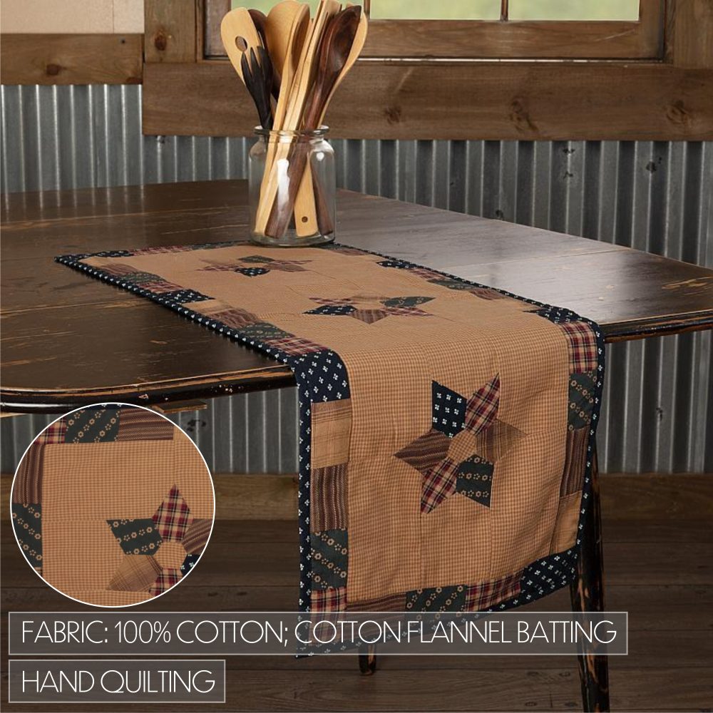 Create a warm, patriotic table for friends and family to gather round with vintage tones and an Americana design. The Patriotic Patch Runner includes on quilted table runner measuring 13x36 inches. The rich texture and straight edging of the quilted cotton fabric is given a uniquely American look with a patchwork style star design in primitive country tones of navy blue, tan and deep red. Complete your tabletop decor with other pieces from the Patriotic Patch Collection by VHC for vintage farmhouse style.