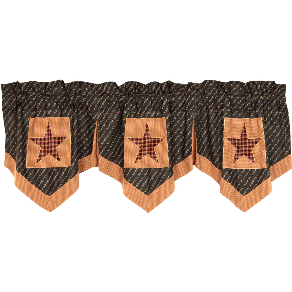 Our Patriotic Patch Block Valance offers an Americana aesthetic of deep red, beige, and navy blue that blend together in the 20x60 pointed edge, appliqued curtain for a classic primitive look. A rod pocket and hidden loops are included near the top of this star valance for easy hanging.