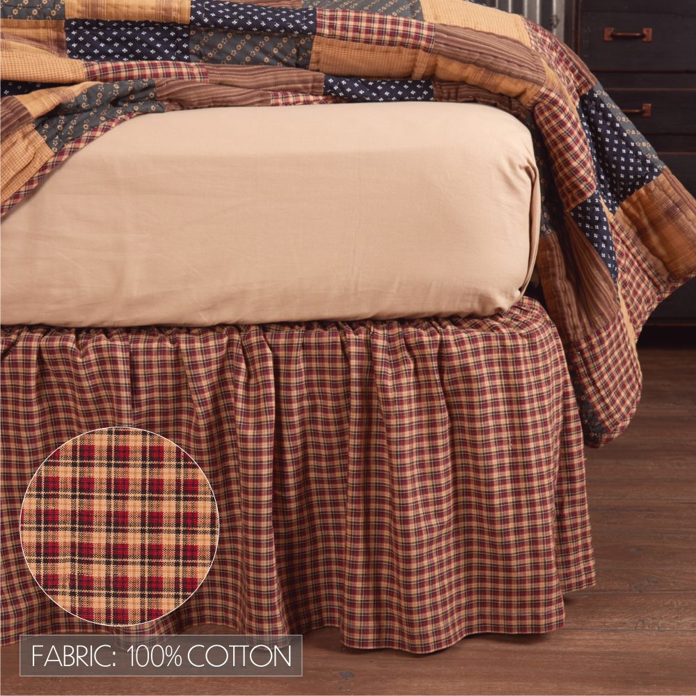 A vintage plaid pattern in deep red, khaki, and navy blue provides the perfect foundation for your primitive Americana bedding. The Patriotic Patch Twin Bed Skirt measures 39x76 inches and features a long 16-inch drop to ensure the skirt reaches your floor. The country style dust ruffle adds a lovely finishing touch to any room by complementing your decor while concealing under-bed storage and blocking dust accumulation in hard-to-reach areas. A generous 3-inch decking border provides increased durability for extended use. Made of 100 percent cotton, this traditional plaid bed skirt is machine washable and iron safe. Coordinates with the Patriotic Patch Collection by VHC for primitive country style and pairs with the Patriotic Patch Quilt (sold separately) for the perfect balance of simple plaid and Americana patchwork.