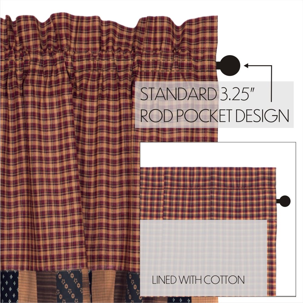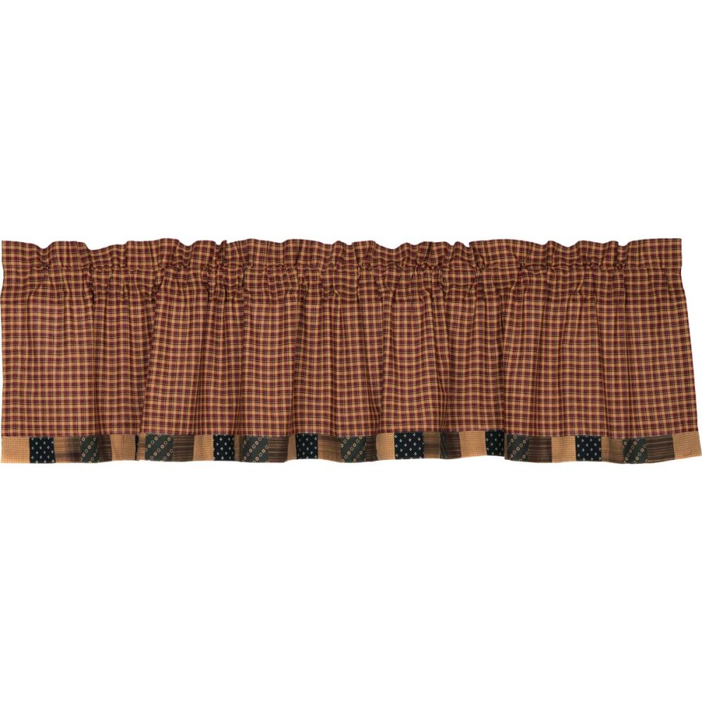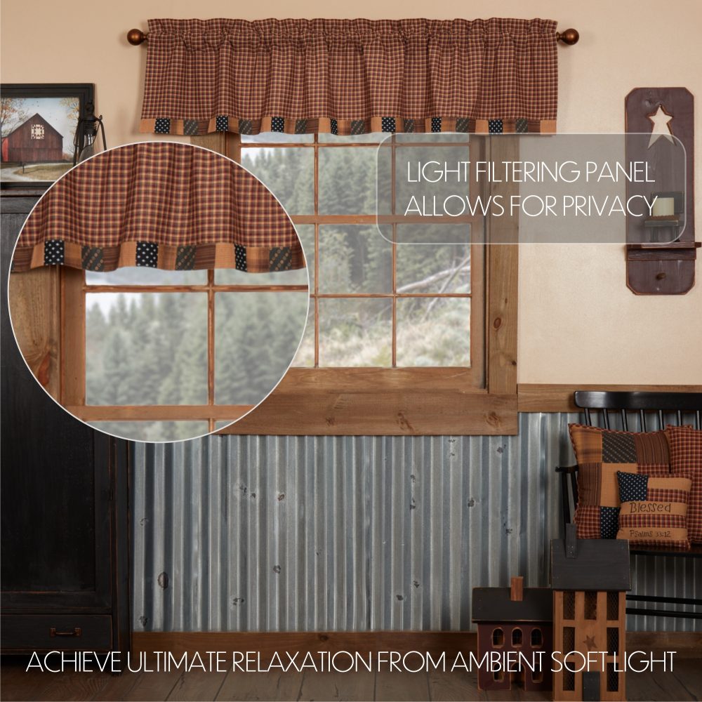 A patriotic, primitive Americana palette of khaki tan, deep red and navy blue blend the crisp lines of traditional plaid with charming patchwork blocks for a unique country look. The Patriotic Patch Block Border Valance measures 16x72 inches and features a straight edge accented by blocks in vintage-inspired patterns for a classic country look. A generous 3.25 inch rod pocket allows for easy hanging.