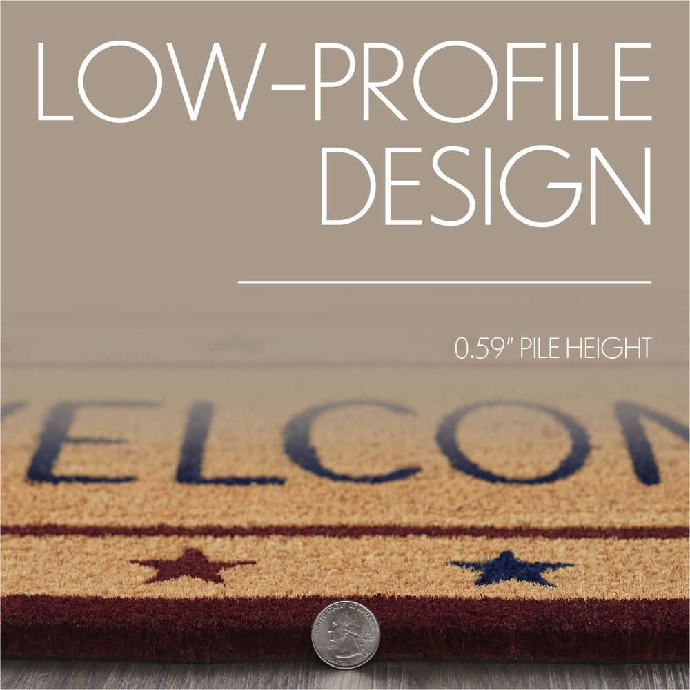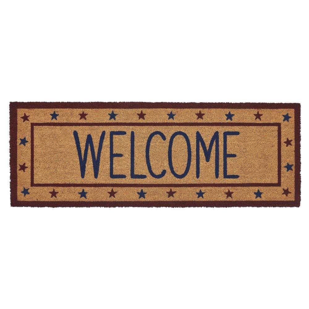 Show your patriotic spirit with the VHC Brands Patriotic Stars Welcome Coir Welcome Rug Rect 17x48. This eye-catching doormat features five-point stars in vibrant shades of merlot red and country blue, surrounding a bold "Welcome" greeting on a natural tan base. The addition of a red border enhances the design, making it a perfect accent for any entryway, especially during Independence Day celebrations. Crafted from durable coir, this rug is designed to effectively trap dirt and debris, helping to keep your entryway clean while providing a decorative touch. The rectangular shape fits perfectly at your doorstep, and the non-slip PVC backing ensures stability, keeping the rug securely in place even in high-traffic areas. Its patriotic theme and welcoming message create a warm atmosphere, making it a great addition to any home that celebrates Americana. For easy maintenance, simply shake or vacuum the rug to remove surface dirt. To maintain its vibrant colors and prolong its lifespan, it's best to keep the VHC Brands Patriotic Stars Welcome Coir Welcome Rug in a sheltered entryway. Combining festive charm with everyday practicality, this rug is an essential piece for any home looking to offer a warm and inviting entrance.