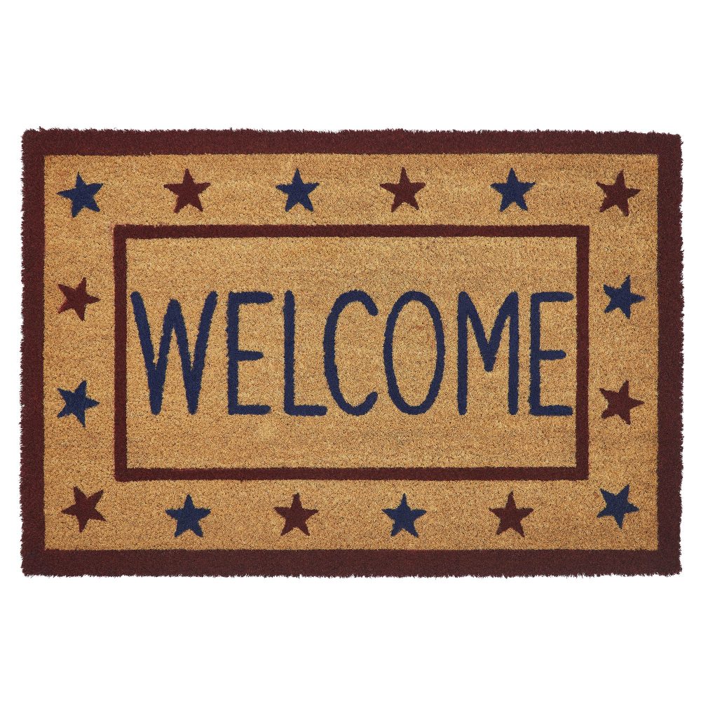 Welcome guests with a festive touch using the VHC Brands Patriotic Stars Welcome Coir Welcome Rug Rect 20x30. This charming doormat features five-point stars in vibrant shades of merlot and country blue, surrounding the warm "Welcome" greeting set against a natural tan base. Accented with a bold red border, this rug embodies Americana style, making it a perfect addition for your entryway, especially during Independence Day celebrations. Crafted from durable coir, this rug is designed to effectively trap dirt and debris, helping to keep your entryway clean while adding a cheerful decorative element. Its rectangular shape fits neatly at your doorstep, while the non-slip PVC backing ensures stability, preventing slips and keeping the mat securely in place even in high-traffic areas. The combination of patriotic colors and welcoming text creates a warm atmosphere that invites family and friends into your home. For easy maintenance, simply shake or vacuum the rug to remove surface dirt. To maintain its vibrant colors and prolong its lifespan, it's best to keep the VHC Brands Patriotic Stars Welcome Coir Welcome Rug in a sheltered entryway. Combining practical functionality with festive charm, this rug is an essential piece for any home that celebrates patriotism and welcomes visitors with a warm smile.