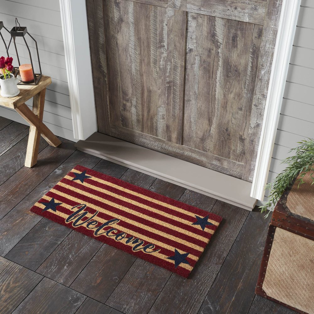 Show your patriotic spirit with the VHC Brands Patriotic Stripes Coir Welcome Rug Rect 17x36. This eye-catching doormat features a vibrant red striped background with bold blue stars placed in each corner, surrounding a warm Welcome greeting. The natural tan coir base adds rustic charm, making it a perfect accent for any entryway or porch. Its Americana-inspired design brings a touch of patriotic pride to your home decor. Crafted from durable coir, this rug is ideal for high-traffic areas, effectively trapping dirt while adding a decorative touch to your doorstep. The non-slip PVC backing ensures stability and keeps the rug securely in place, providing both safety and functionality. Whether celebrating Independence Day or embracing Americana year-round, the patriotic stars and stripes design offers a festive yet rustic welcome to your guests. For easy maintenance, simply shake or vacuum the rug to remove surface dirt. To preserve its bright colors and extend its life, keep the VHC Brands Patriotic Stripes Coir Welcome Rug in a sheltered entryway. Combining patriotic flair with everyday practicality, this rug adds a warm, inviting touch to your home, making it the perfect addition for any country or Americana-themed space.