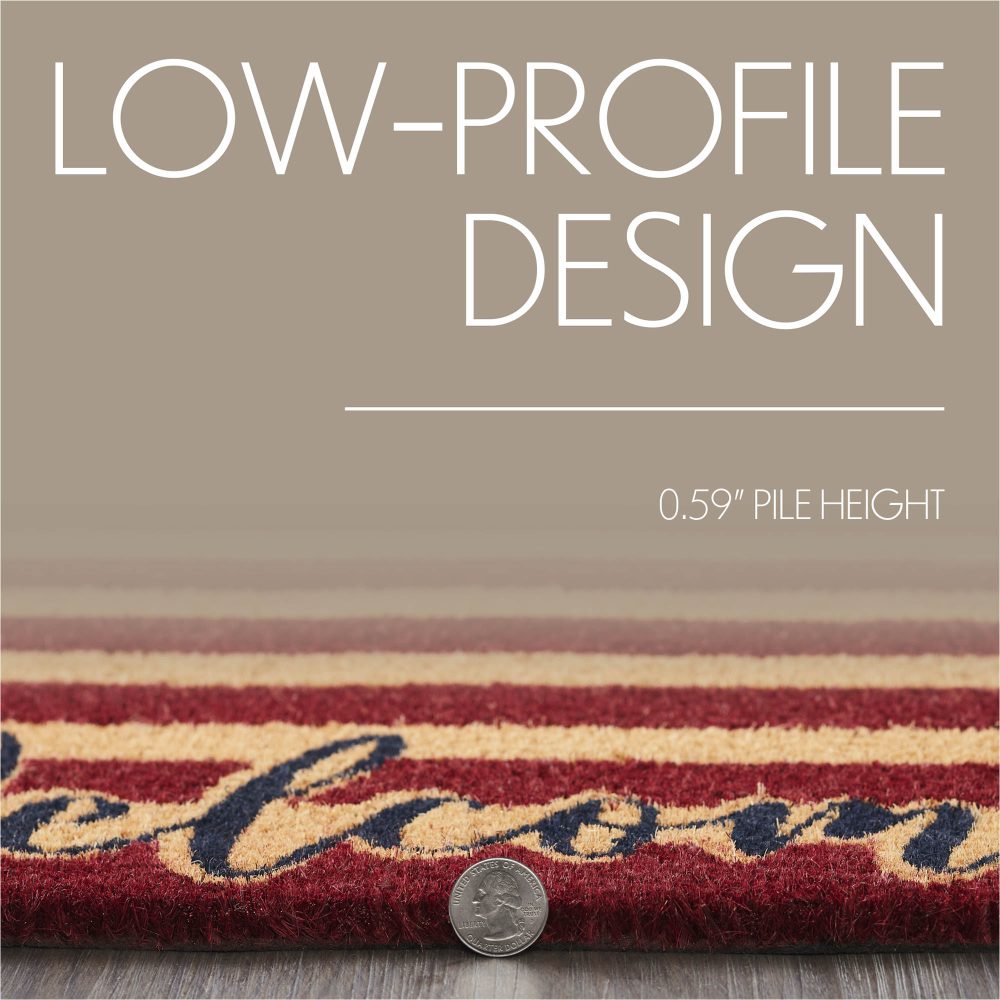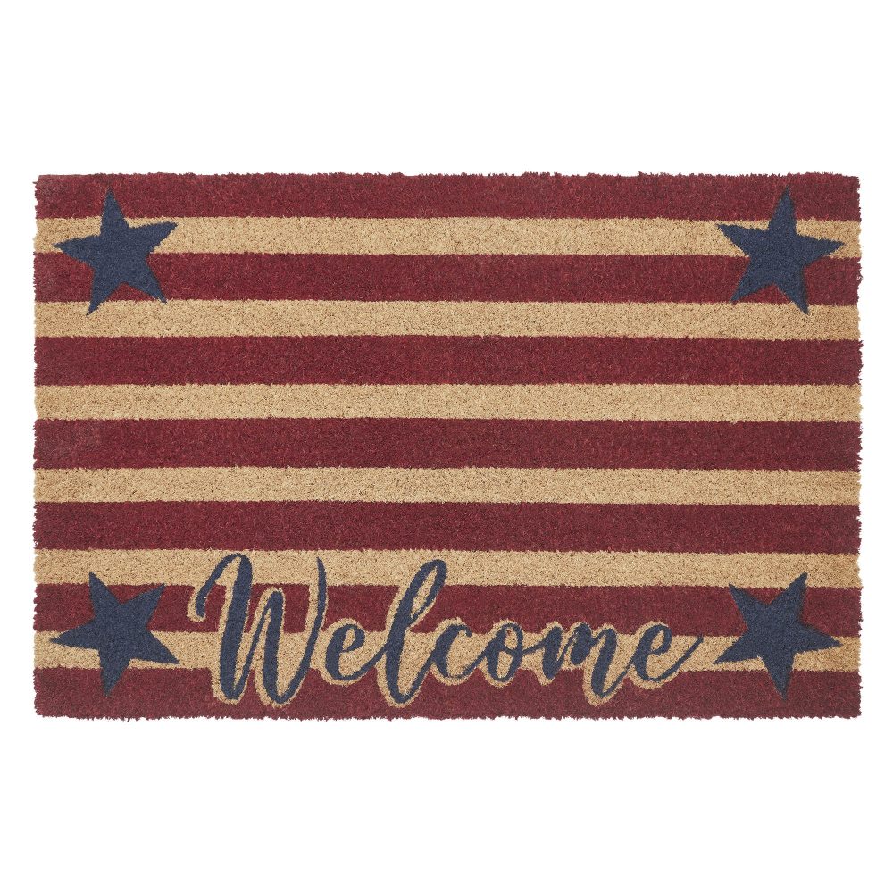 Welcome your guests with a burst of patriotic charm using the VHC Brands Patriotic Stripes Coir Welcome Rug Rect 20x30. This vibrant doormat features a bold red striped background, perfectly complemented by blue stars placed in the corners, creating a delightful "Welcome" message. The combination of natural tan, merlot red, and country blue brings a cheerful touch to any entryway, making it an ideal accent for celebrating Independence Day or showcasing your love for Americana year-round. Crafted from durable coir, this rug is designed to effectively trap dirt and debris, helping to keep your home clean and inviting. The rectangular shape fits snugly at your doorstep, while the non-slip PVC backing ensures stability, preventing slips and keeping the mat securely in place even in high-traffic areas. The playful stars and stripes design captures the spirit of patriotism, creating a warm and welcoming atmosphere for family and friends. For easy maintenance, simply shake or vacuum the rug to remove surface dirt. To preserve its vibrant colors and prolong its life, it's best to keep the VHC Brands Patriotic Stripes Coir Welcome Rug in a sheltered entryway. Combining functional design with festive flair, this rug is a must-have addition to any home looking to greet visitors with warmth and a sense of pride.