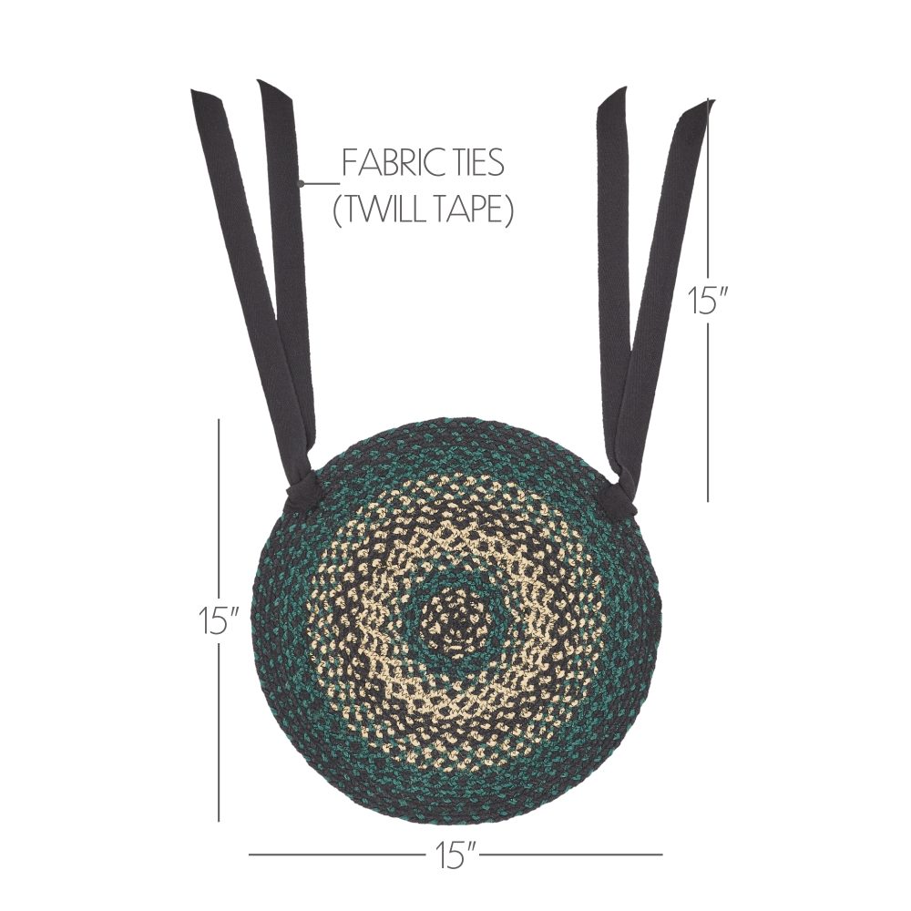 Bring warmth and cheer to your kitchen with braided jute in rich pine green, soft black and beige. The Pine Grove Jute Chair Pad is a durable 15 inch round chair cushion with long ties to easily add a pop of rustic country style to a wide variety of seating. This round seat pad features an 80 percent jute blend that lays flat easily for natural texture and style while offering your chair protection from damage. Spot clean and iron as needed. To give your kitchen or tabletop a complete look, pair with other items from the Pine Grove Collection including rustic farmhouse placemats, table runners and more for a deeply inviting, feels-like-home dining space.