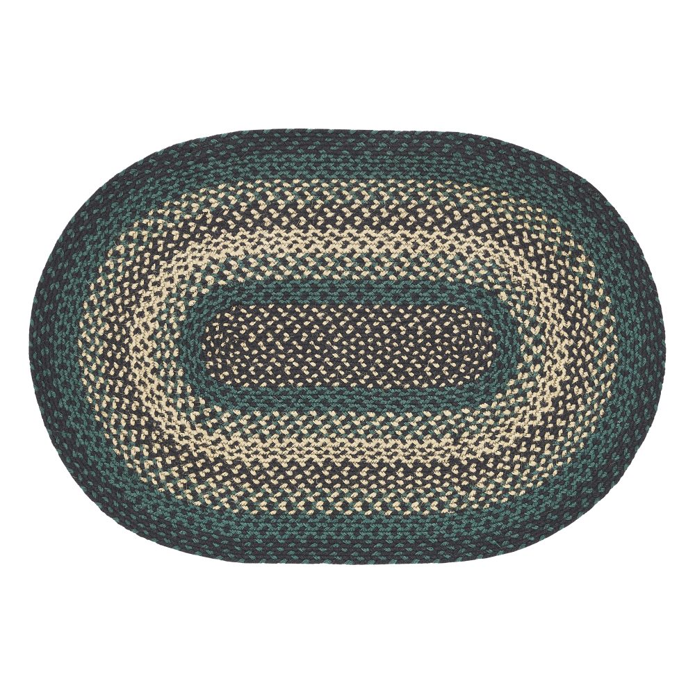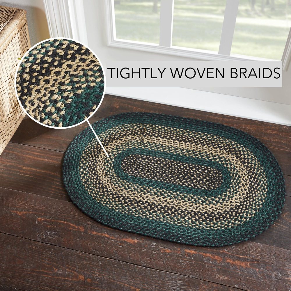Create a bold, rustic look with deep forest colors in a curl-resistant jute blend that adds style and safety anywhere a mid-size accent rug is needed. The Pine Grove Jute Rug measures 24x36 inches and features a classic oval shape and tight braids constructed with a durable jute blend. The special blend relaxes faster and stays flat. Features a blend of pine green, natural tan and soft black for a dark, rustic look that complements a wide array of country farmhouse or cozy cabin decor.