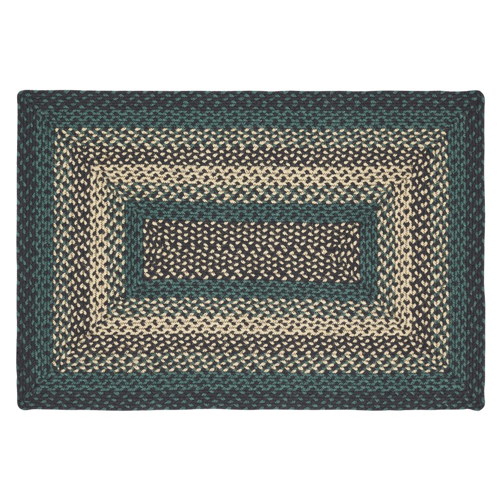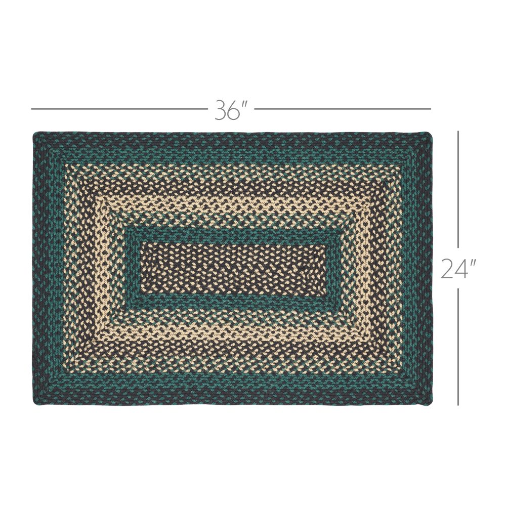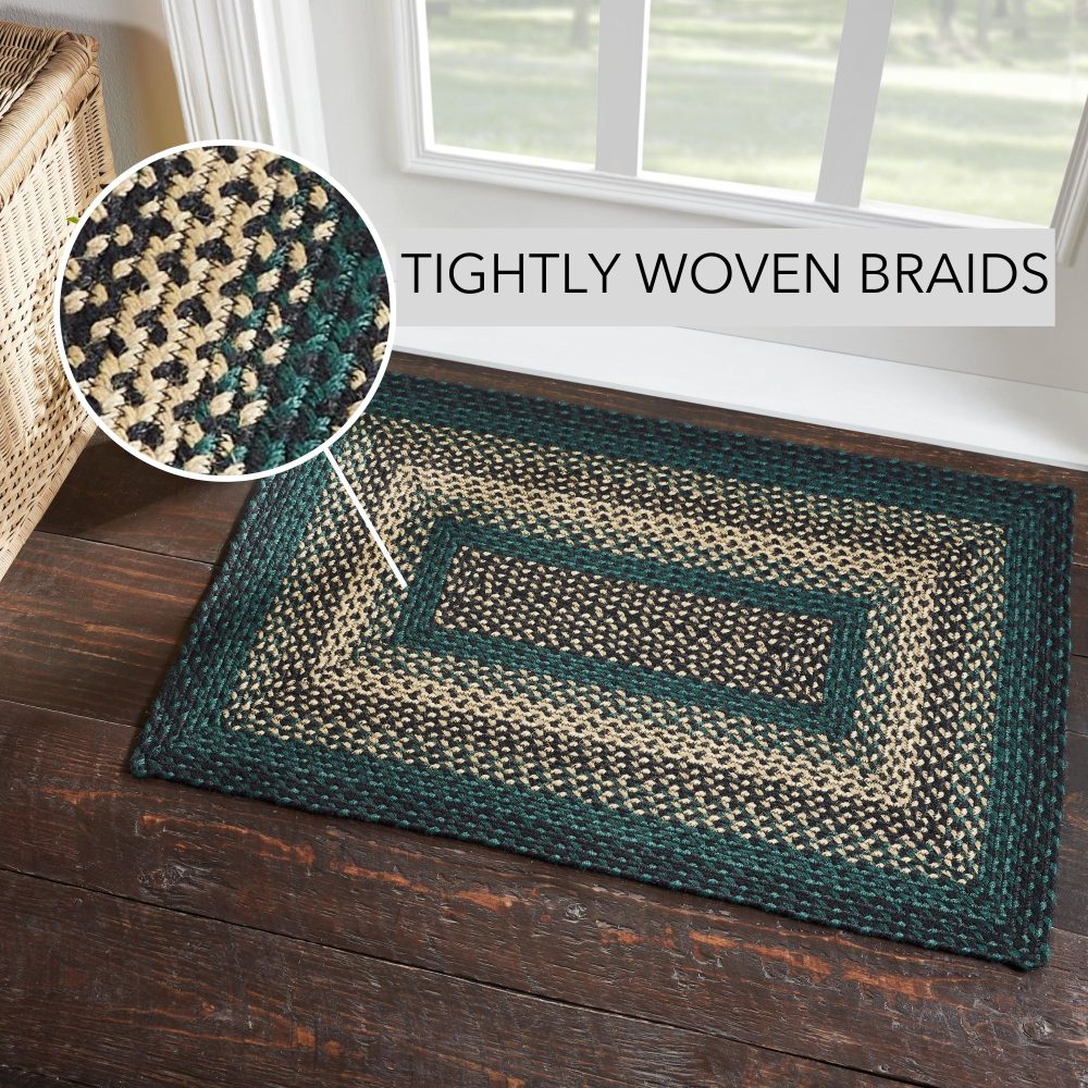 Create a bold, rustic look with deep forest colors in a curl-resistant jute blend that adds style and safety anywhere a mid-size accent rug is needed. The Pine Grove Jute Rug measures 24x36 inches and features a classic rectangle shape and tight braids constructed with a durable jute blend. The special blend relaxes faster and stays flat. Features a blend of pine green, natural tan and soft black for a dark, rustic look that complements a wide array of country farmhouse or cozy cabin decor.