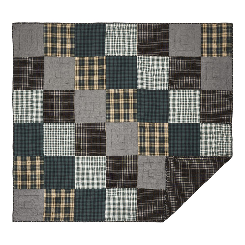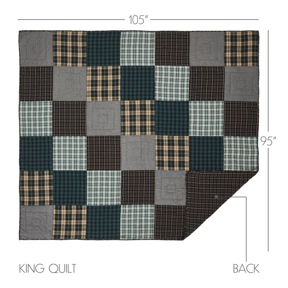 Bring the warm, cozy comfort of a rustic lodge to your bedroom with a hand-stitched patchwork of deep, woodsy plaids. The Pine Grove King Quilt measures 105 by 95 inches and features a mix of deep green, soft black, natural tan, and grey in classic plaid patterns. The 100 percent cotton quilt is backed by a simple black and tan plaid. Machine washable and iron safe, the bedspread is made to last with quality Stitch in the Ditch and Echo style quilting techniques. Coordinates with the Pine Grove Collection by VHC for accents and staples to create primitive farmhouse styles for your home.
