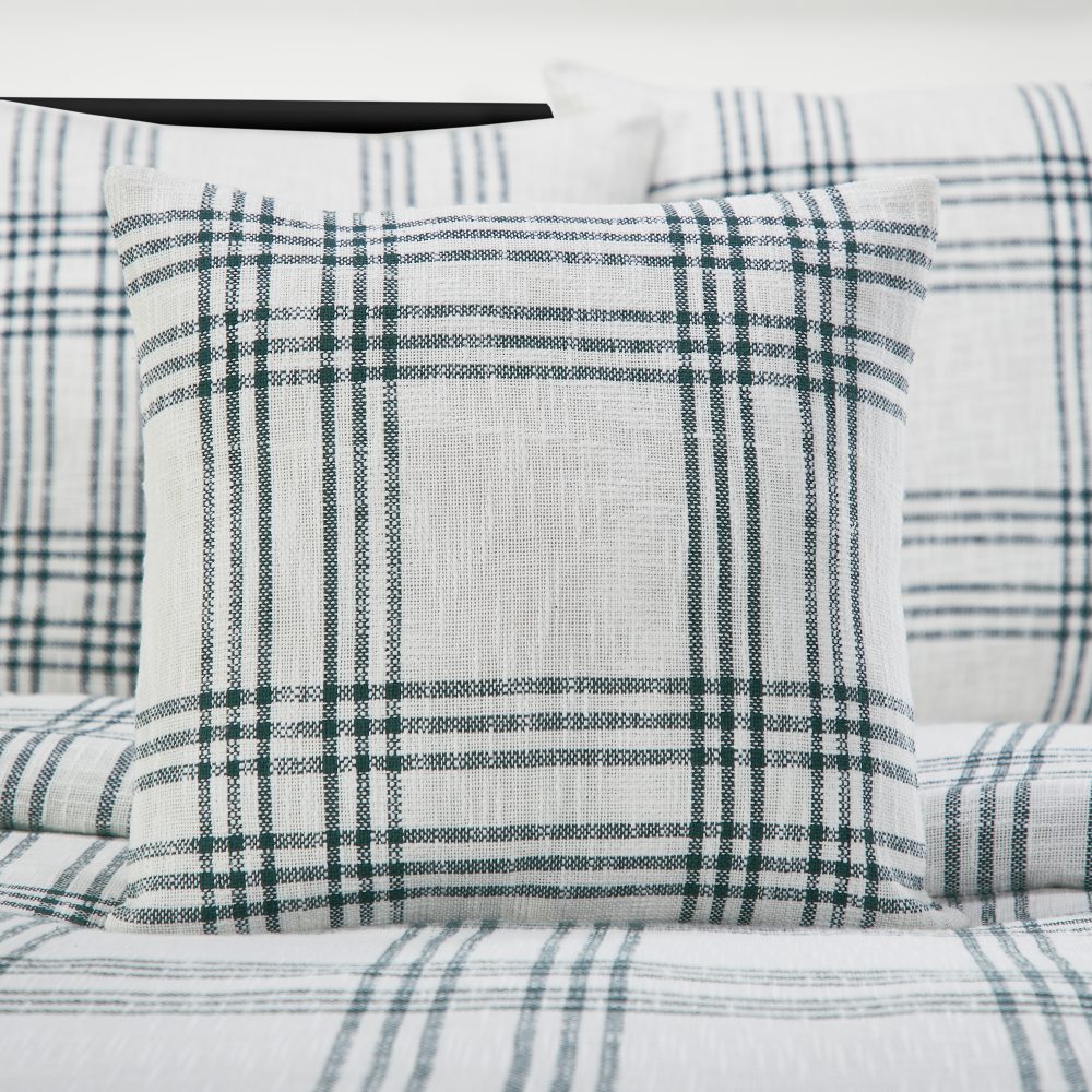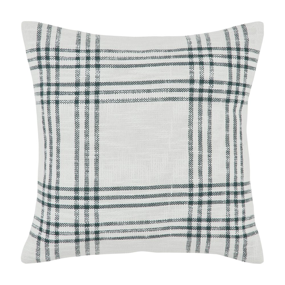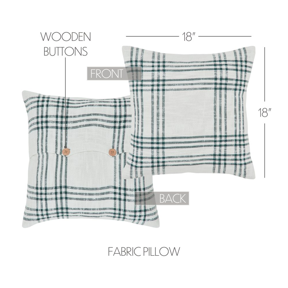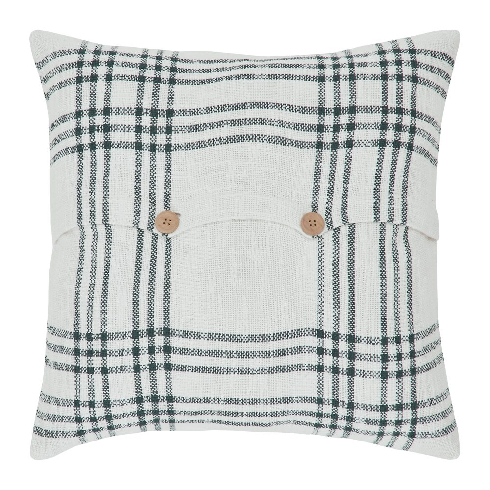 Add a pop of soft white and pine green to your farmhouse home decor for effortless style year-round. The Pine Grove Plaid Fabric Pillow measures 18 by 18 inches and features a 100 percent cotton base in soft white with large-scale, deep green striping for a simple, classic plaid look. Reverses to the same fabric with wooden button-style closures for easy cleaning. Machine washable and iron safe. Coordinates with the Pine Grove Collection by VHC for casual, timeless style. This square accent pillow adds a touch of modern country charm to your couch, sofa, entryway bench, bed or rocking chair.