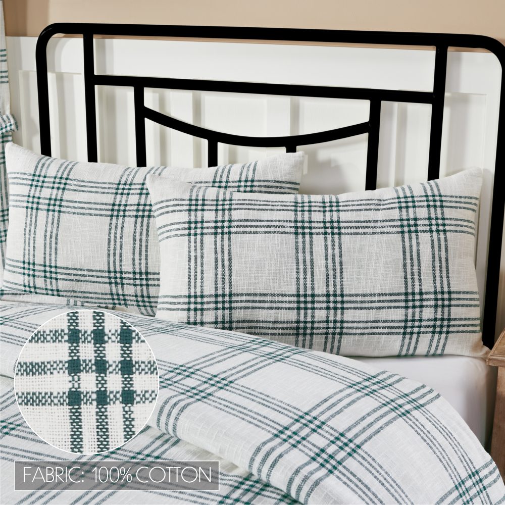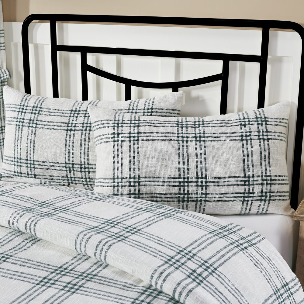 Transform your home into a cozy country retreat with clean white and beautiful pine green. The Pine Grove Plaid Fabric King Sham measures 21x37 and features soft, cotton fabric in a modern, minimalist plaid pattern. Straight edging and button-style closures combine to create a warm and welcoming look perfect for classic country and cottage-style decor. Coordinates with the Pine Grove Plaid Collection by VHC for a complete farmhouse look for your room or pair with holiday decor for a festive look during the Christmas season. Machine washable and iron safe.