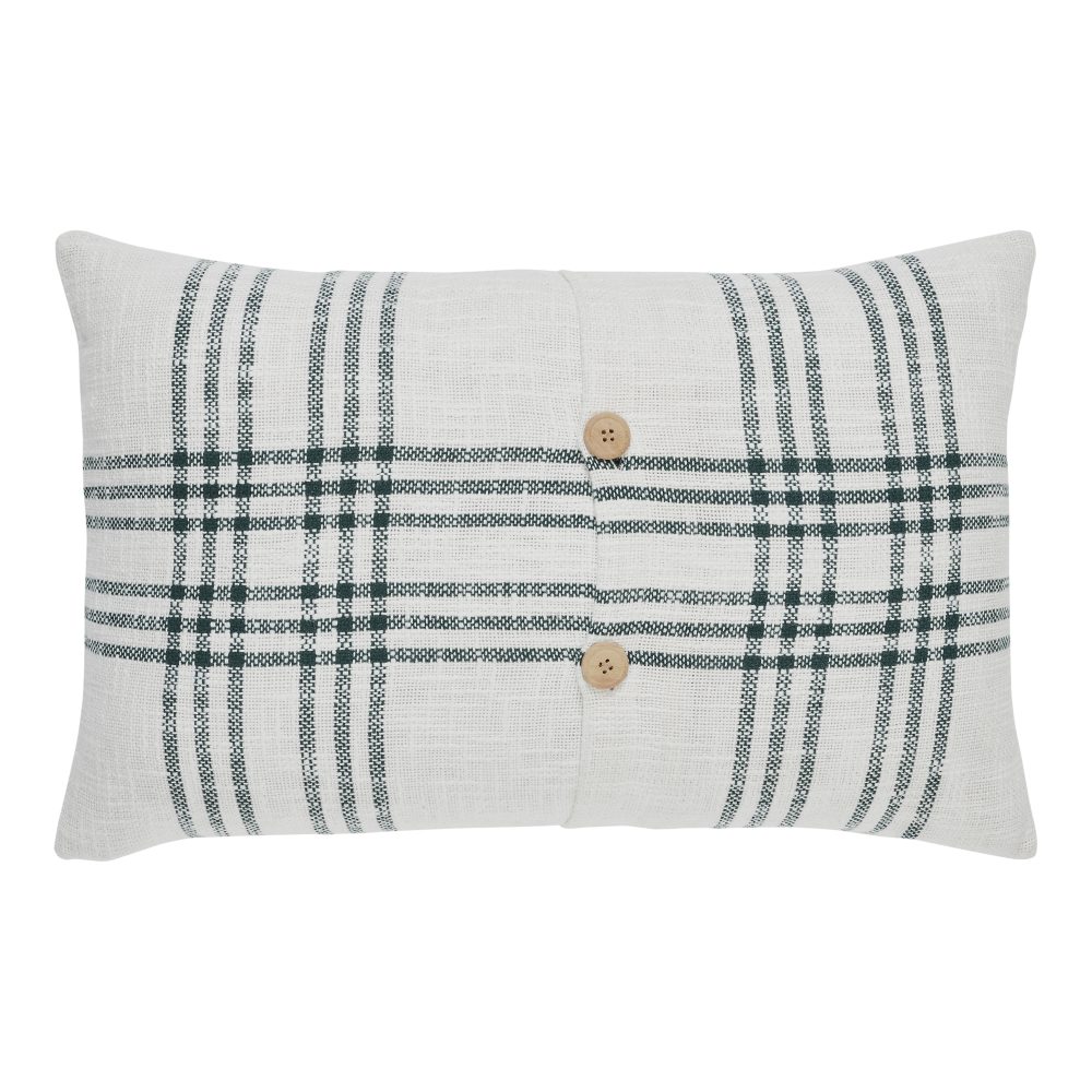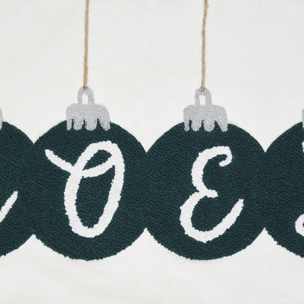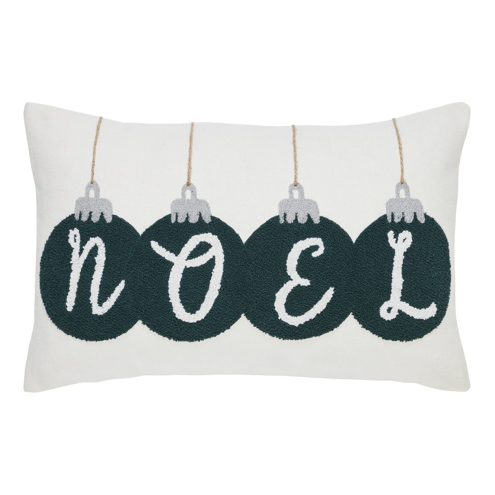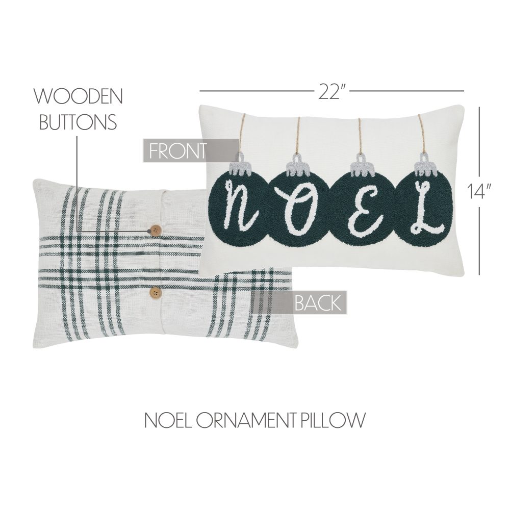 Add a festive Christmas touch to your decor with our 14x22 Pine Grove Plaid Noel Ornament Pillow. Rich alternating colors of pine green, silver and white add a Christmas element and neutral backdrop to complement your decor. The woven texture and embroidered ornaments in pine green that spell out Noel with small silver caps and strings add a charming holiday twist to a sophisticated farmhouse look. Coordinate with the Pine Grove Collection by VHC to add festive holiday looks to your modern farmhouse home decor.