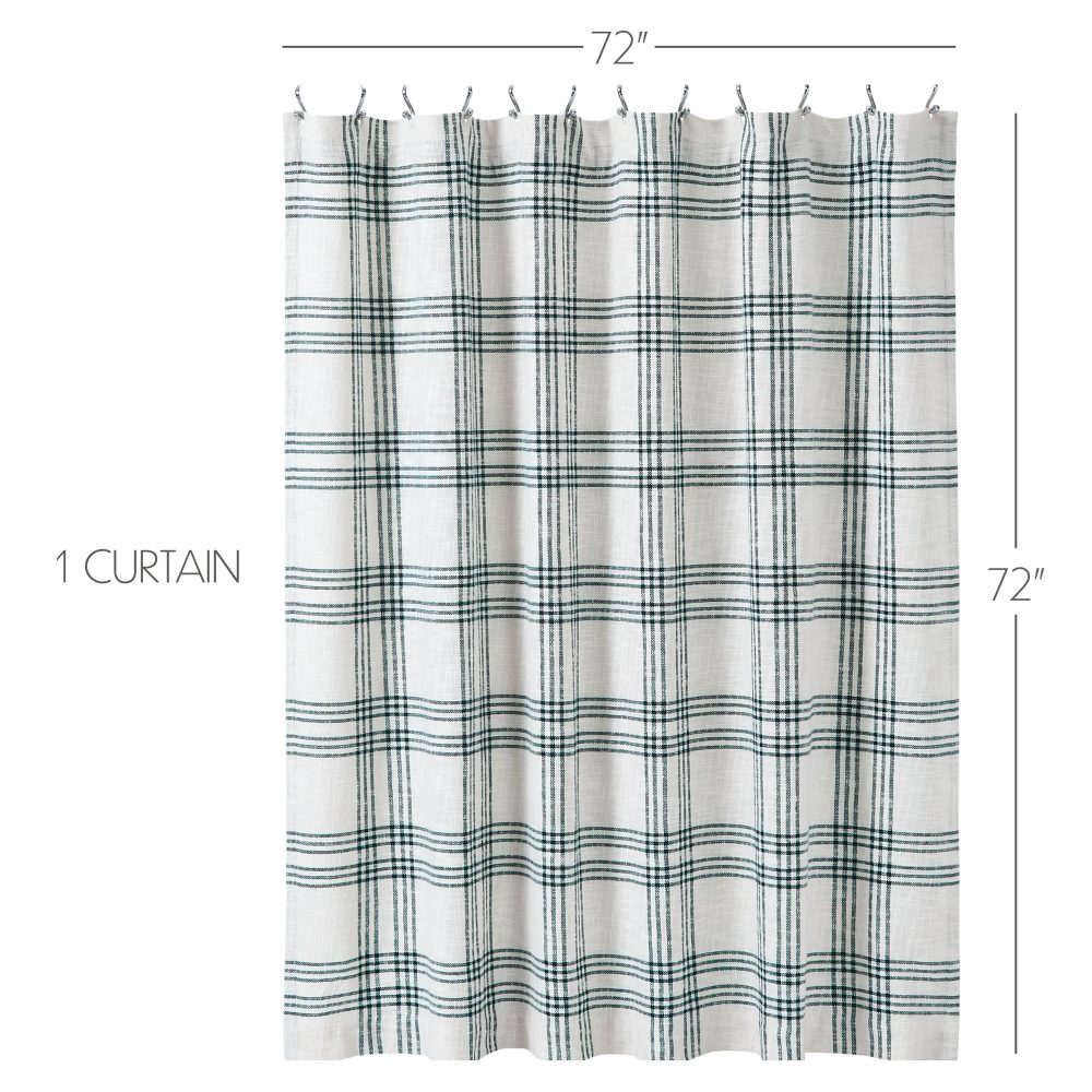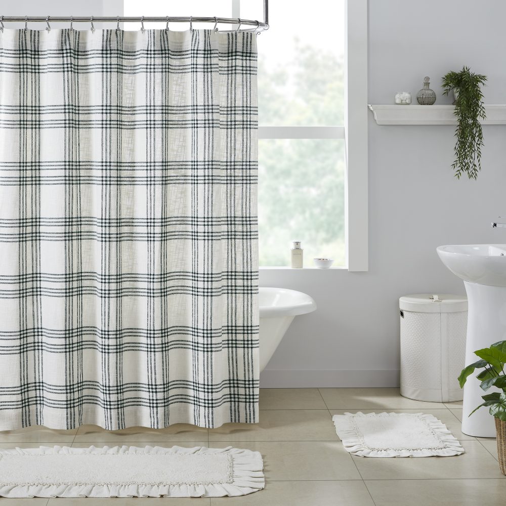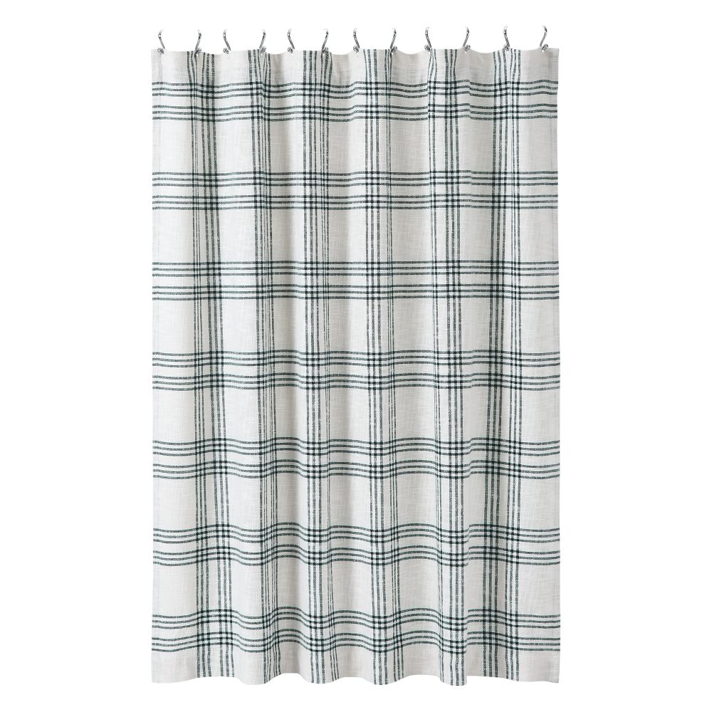 Create a clean, modern farmhouse look for your bath. The Pine Grove Plaid Shower Curtain features beautiful pine green striping over a white base to create a classic yet modern-feeling plaid. Measures 72 by 72 inches to fit standard sized showers and baths. Easily hang this classic country bath curtain with shower hooks of your choosing (not included) using the button holes attached. A 3" rod pocket is also available as an alternative hanging method.