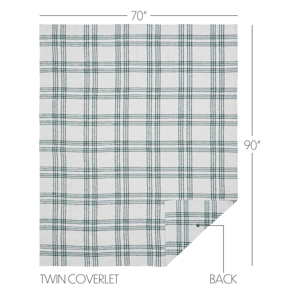 Light in weight, but not in crisp, modern country farmhouse style. The Pine Grove Plaid Twin Coverlet measures 70x90 and adds a comfortable layer for warm seasons and style and extra warmth for cooler months. The reversible design of this 100 percent cotton blanket features a soft and comfortable feel with a textured, woven fabric in a minimalist, large-scale plaid pattern. A white base brightens the look of your room while pine green stripes add delightful farmhouse style to your decor. Coordinates with shams, pillows, panels, and more from the Pine Grove Plaid Collection by VHC for a sophisticated deep green and white look and classic country charm or add to your seasonal decor for Charming Christmas style.
