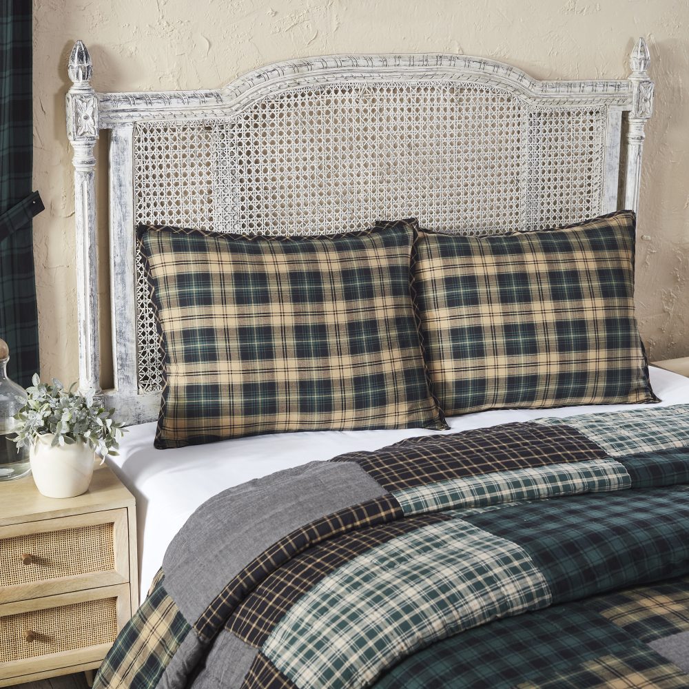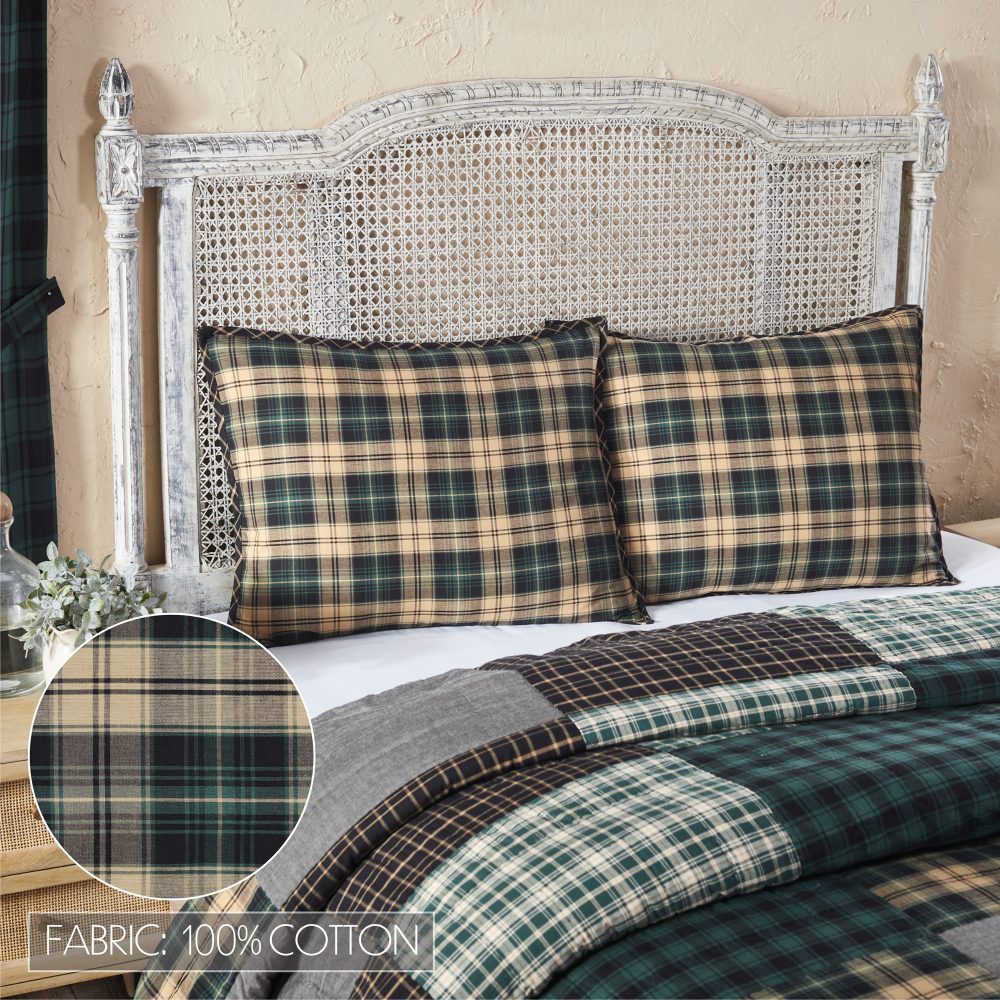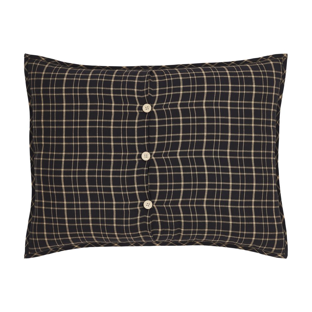 Transform your home into a cozy rustic retreat with rich black and beautiful pine green. The Pine Grove Fabric Standard Sham measures 21x27 and features soft, cotton fabric in a classic plaid pattern in deep green and warm tan. Reverses to soft black and tan plaid with button-style closures. The reversible patterns in coordinating deep, woodsy hues create a warm and welcoming look perfect for classic country and lodge-style decor. Coordinates with the Pine Grove Collection by VHC for a complete country farmhouse look for your room. Machine washable and iron safe.