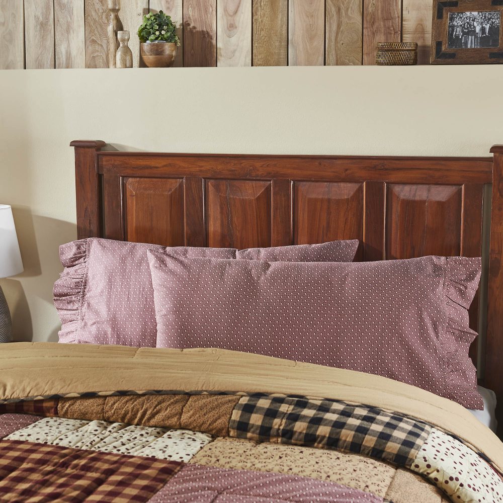 Introducing the VHC Brands Pip Vinestar Ruffled King Pillow Case Set, a perfect addition to your country-themed bedroom. This set includes two 21x36+4 inch rectangular pillow cases, crafted from high-quality flat weave cotton. The burgundy color and charming star pattern, inspired by primitive country aesthetics, add a touch of rustic charm to your bed, transforming it into a decorative and cozy haven. Designed for king-size pillows, these pillow cases are not just functional covers but also delightful decorative accents. The Pip Vinestar Collection is known for its timeless style, and this set complements it perfectly. Elevate the ambiance of your bedroom with these rustic and decorative king-sized pillow cases that blend style, comfort, and durability in one. Crafted with meticulous attention to detail, the durable cotton fabric ensures both a comfortable and long-lasting experience. Add a touch of country elegance to your bed with the VHC Brands Pip Vinestar Ruffled King Pillow Case Set and indulge in the primitive charm that radiates from this cozy, star-patterned bedding accessory.