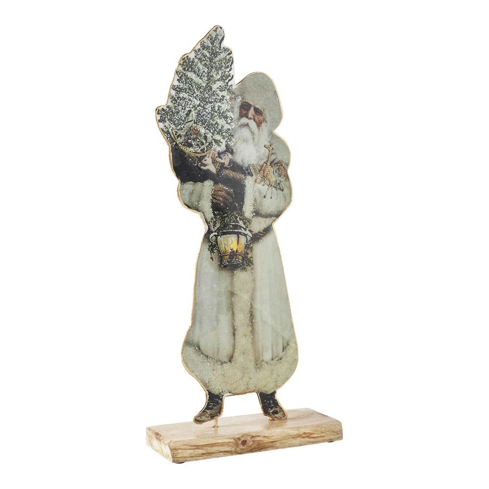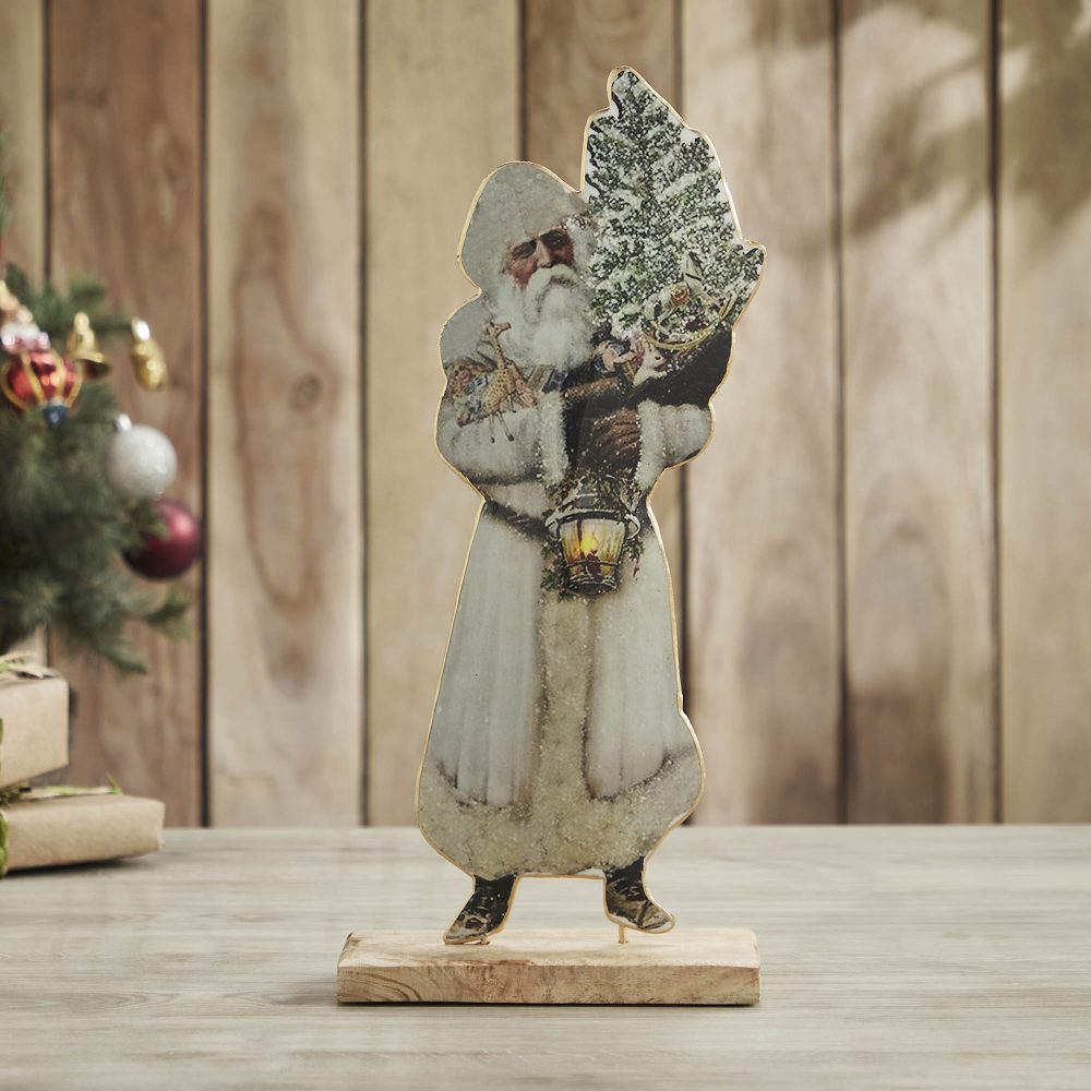 Add a touch of Old World charm to your winter and Christmas decor with the exquisite VHC Brands Metal Pipka Santa Christmas Tree Figurine. Measuring 16 inches in height, this captivating figurine depicts a traditional Santa Claus carrying a beautifully adorned Christmas tree in his sack. Crafted from durable metal and tropical wood, it boasts intricate detailing and rustic elegance, making it an enchanting addition to tabletops and shelves in your dining room, entryway, or living room. The delightful combination of light creme, Christmas green, and country black hues infuses this figurine with a festive spirit, evoking the timeless appeal of primitive Christmas decor. Its primitive design and distressed appearance add to its vintage charm, creating a nostalgic ambiance that warms the heart and uplifts the soul during the holiday season. Whether displayed as a standalone accent piece or as part of a larger decorative arrangement, the Pipka Santa Christmas Tree Figurine serves as a cherished symbol of joy and tradition. Maintaining the pristine condition of this figurine is effortless - simply wipe it clean with a soft cloth to remove any dust or debris, ensuring that it remains a focal point of your winter and Christmas home decor for years to come. With its enduring beauty and whimsical character, the VHC Brands Metal Pipka Santa Christmas Tree Figurine brings the magic of the holiday season to life, filling your home with warmth, cheer, and festive cheer.