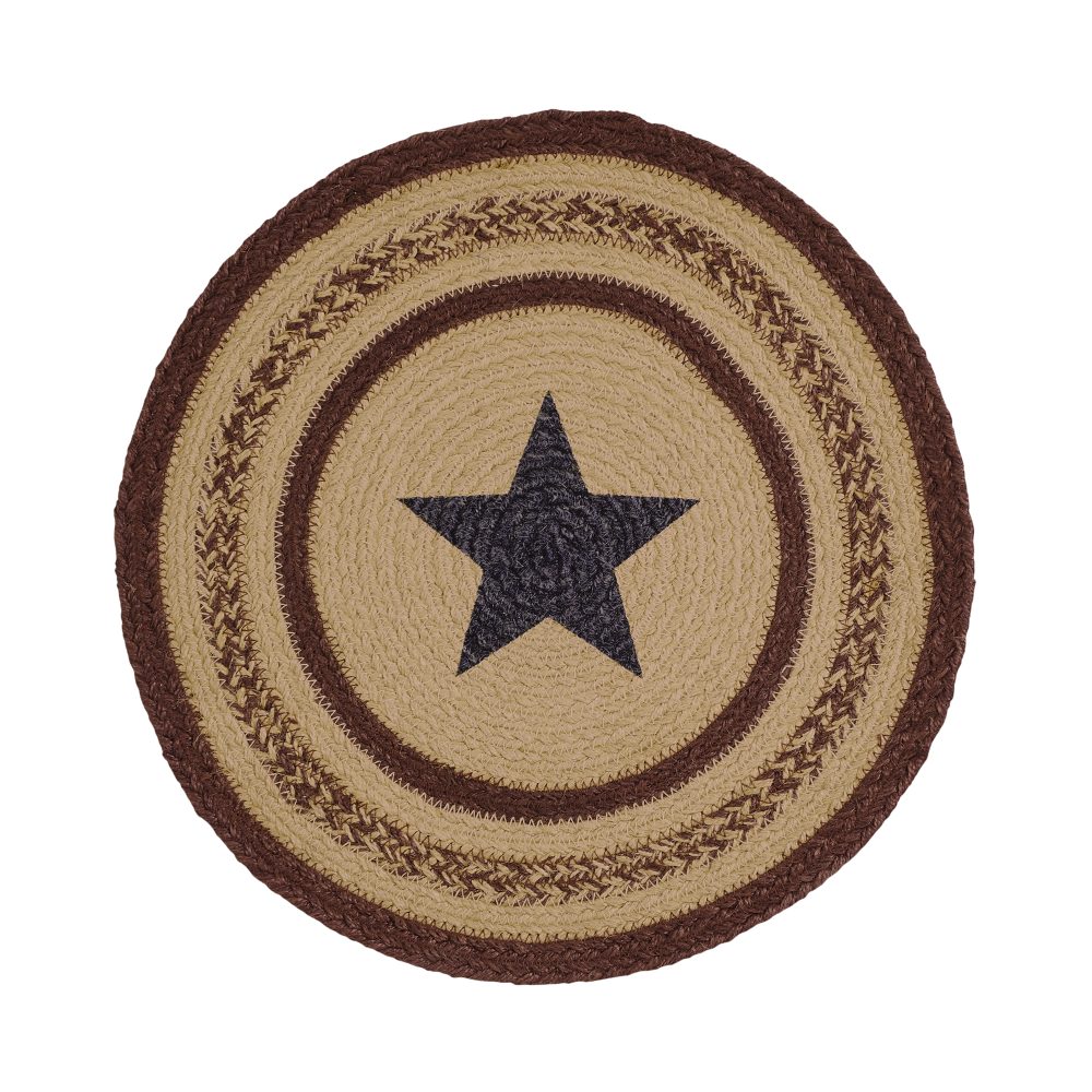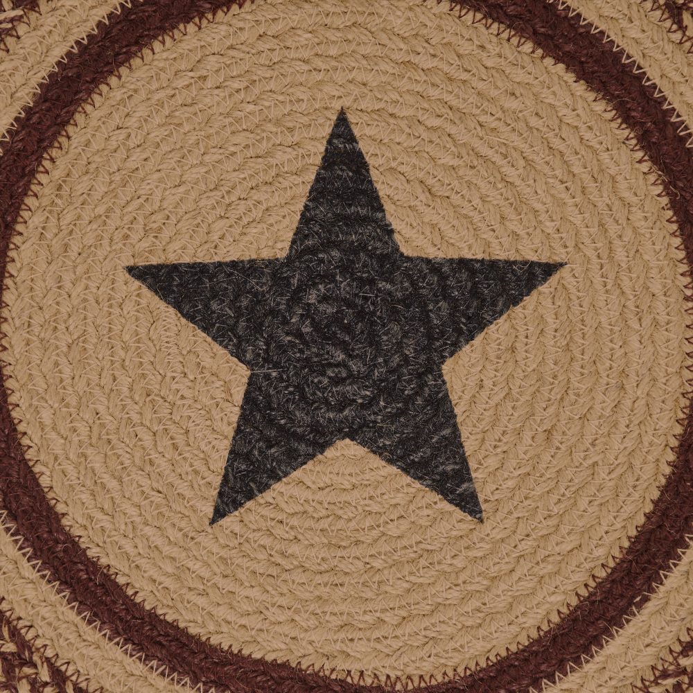 Who says trivets have to be boring? Protect counters and tables from hot pans and dishes with an Americana design and classic texture. The Potomac Jute Trivet includes one circular trivet with a 15-inch diameter made from a premium Jute blend. The rich texture of braided jute is given a primitive twist with alternating burgundy and natural tan striping framing a central five point star design in navy blue. Complete your tabletop decor with other pieces from the Potomac Collection by VHC for patriotic farmhouse style.
