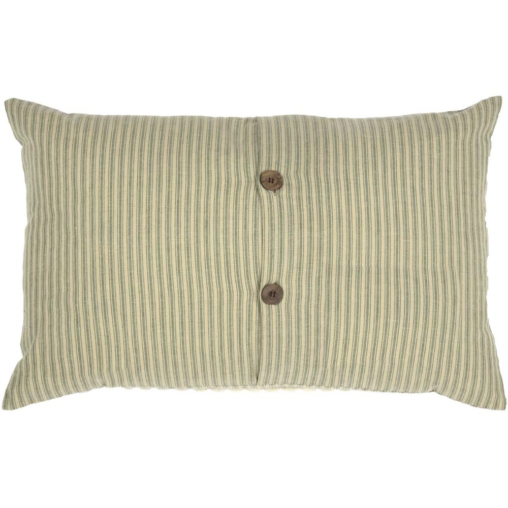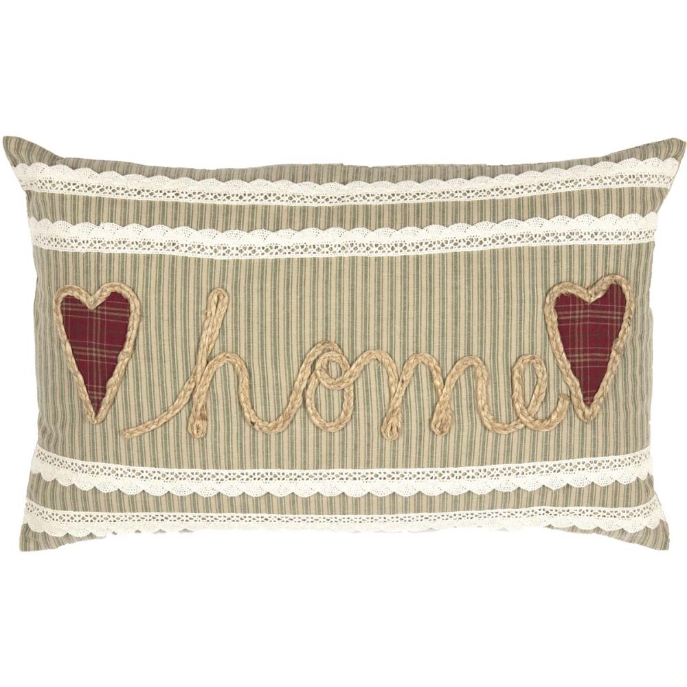 Warm khaki and sage striping with rustic details bring a soft, primitive style to your home. The Prairie Winds Home Pillow measures 14 by 22 inches. The cozy, rectangular accent pillow features a classic ticking stripe base in earthy, traditional farmhouse colors softened by creme lace accents. The charming trim gently frames a loopy, braided jute word art accent reading, "home" and two red plaid primitive-style hearts outlined in jute. Constructed with cotton and jute with a polyester fill. Includes a removable cover with button-style closures for easier cleaning. Hand clean for best results. Coordinates withe Prairie Wind Collection by VHC for traditional, country style.
