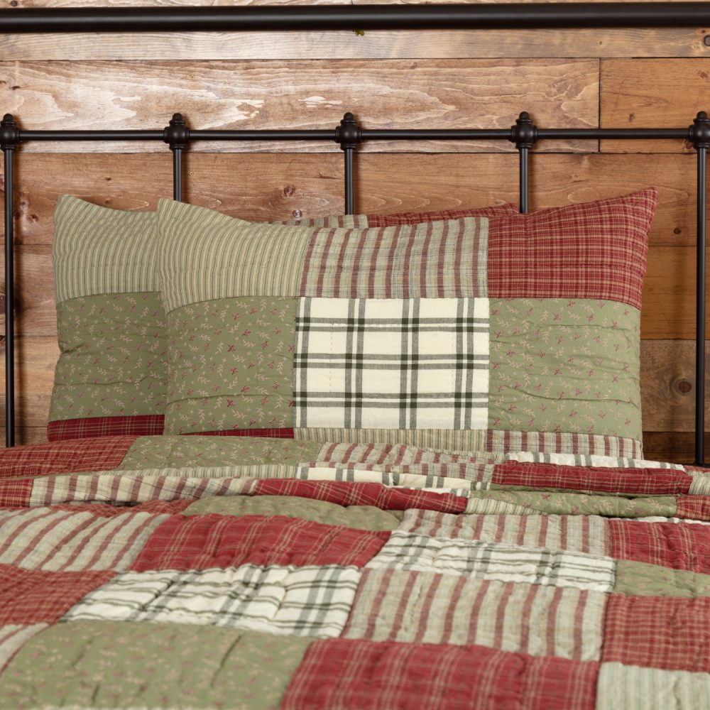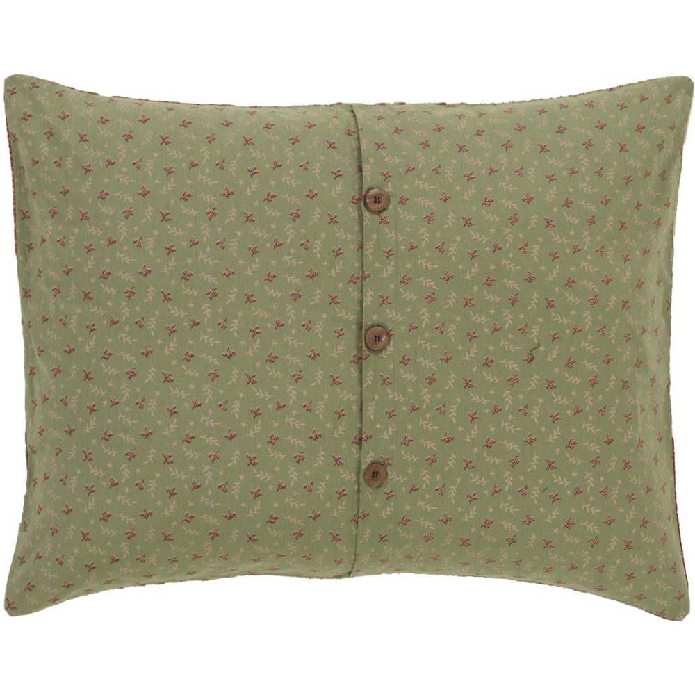 Create a warm, rustic retreat with cozy colors and classic country style. The Prairie Winds Standard Sham 21x27 features quilted blocks in charming, woodsy tones including brick red, sage green and khaki tan. A mix of plaids, soft stripes and ditsy florals add a comfortable vintage appeal that combines with high-quality hand quilting techniques to create a piece with an heirloom quality look and feel. Reverses to a quaint ditsy-style floral print in sage green with wooden button-style closures. Coordinates with the Prairie Winds Collection from VHC for a classic, primitive country style that makes any room feel like home.